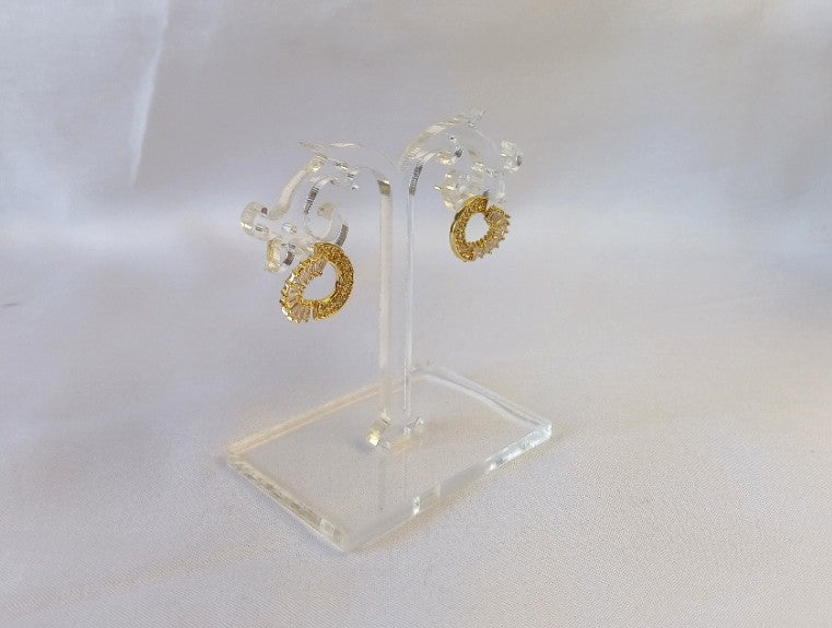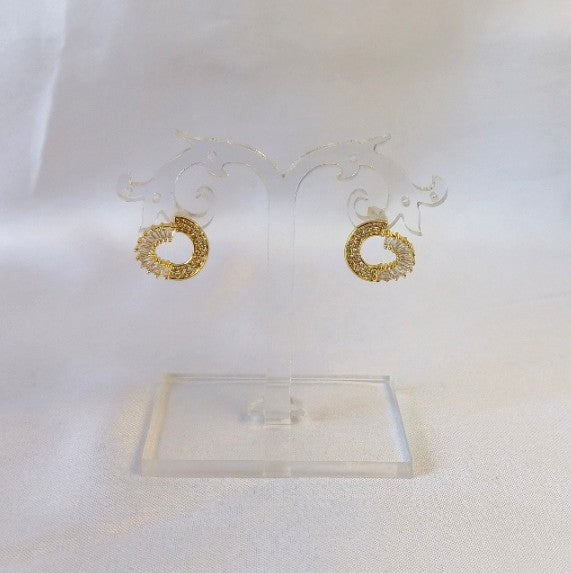 These AD Circle Studs feature a delicate golden circle design adorned with sparkling American diamonds. Their classic yet elegant look adds a subtle shine, perfect for enhancing everyday outfits or special occasions with confidence and charm.