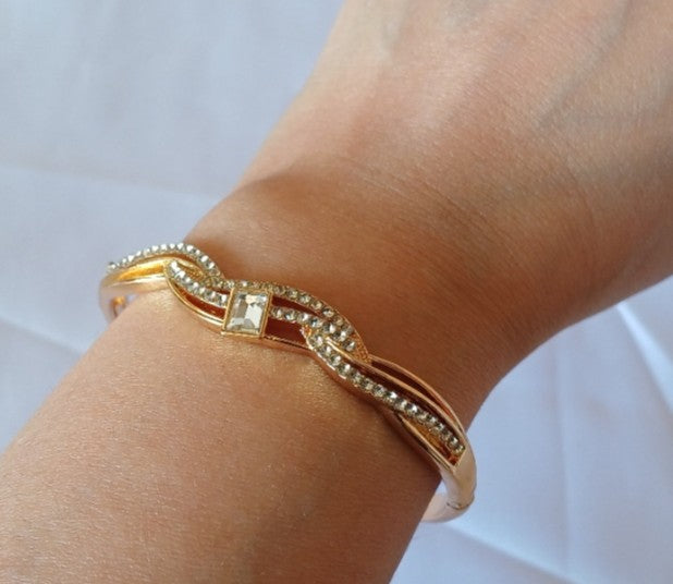 The Allison Golden Bangle is a stunning blend of elegance and sparkle. Crafted with a radiant gold finish, it features a mesmerizing wave design adorned with shimmering American diamonds. Perfect for adding a touch of sophistication to any outfit, this bangle is a must-have for those who love timeless glamour.
