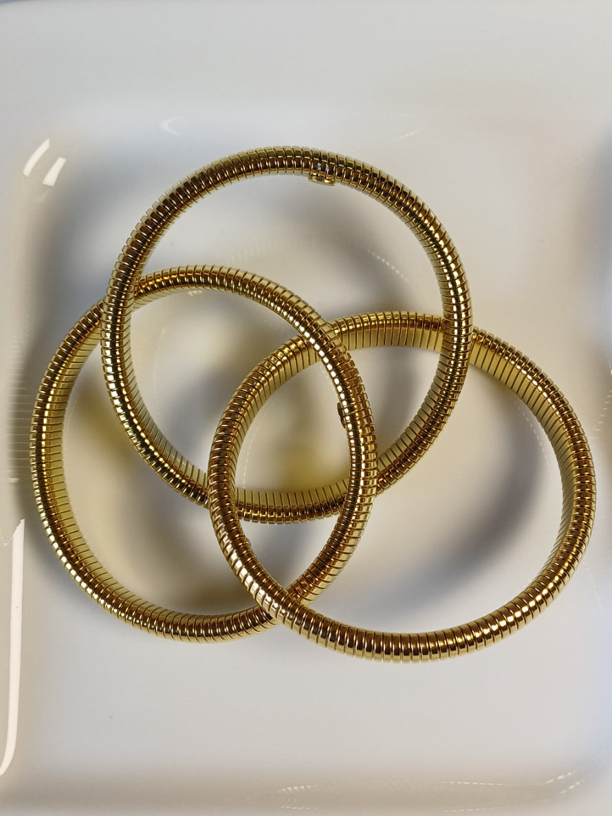 The Amaya Bangle features three golden bangles elegantly intertwined to create a broad, striking stack. This design offers a unique blend of sophistication and boldness, perfect for adding a graceful touch to any outfit. Its intertwined structure ensures a comfortable fit while making a stylish statement. Ideal for everyday wear or special occasions, the Amaya Bangle enhances your look with effortless charm.