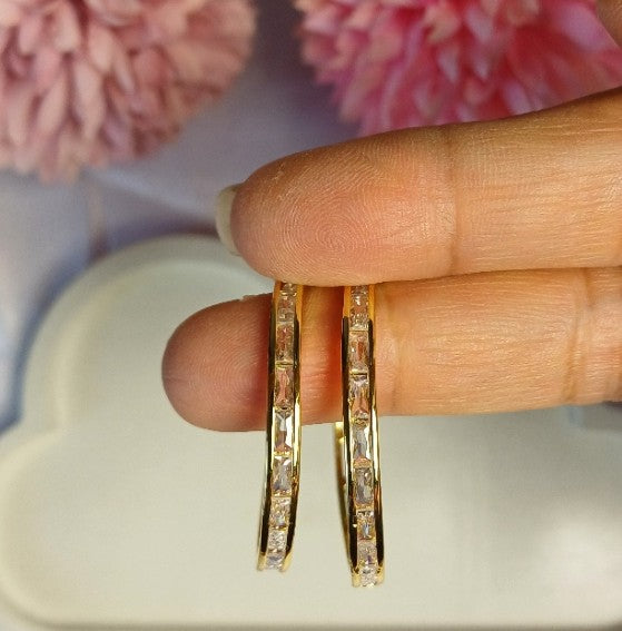 Elevate your evening look by pairing the Ayra C Hoop Earrings with a sleek black jumpsuit or a satin saree—let the golden shine and sparkle of the American diamonds frame your face beautifully with a neat bun or soft curls tucked behind the ear.