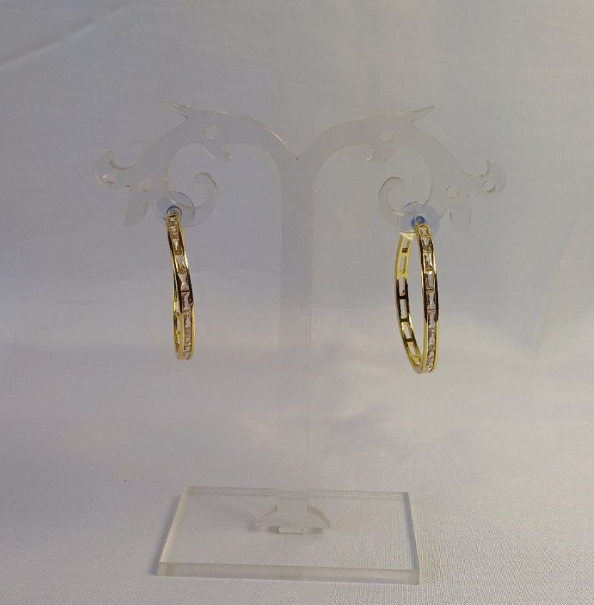 Elevate your style with the Ayra C Hoop earrings, featuring a radiant golden finish adorned with sparkling American diamonds. These hoops add a touch of elegance and shimmer to any outfit, making them perfect for both everyday wear and special occasions.
