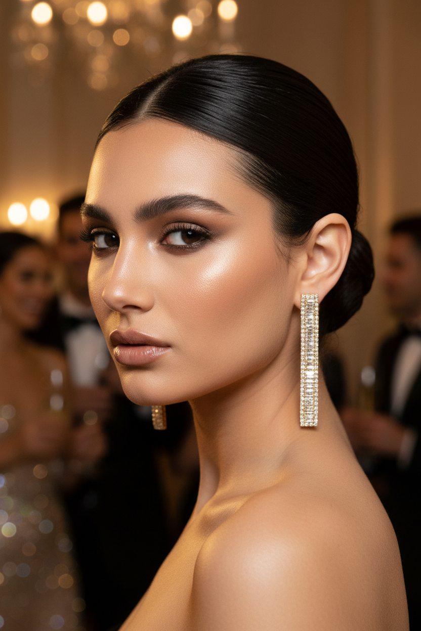 Let the Ayra Dangler be the star—pair it with a sleek bun or side-swept waves and a solid-colour outfit like satin, silk, or crepe. Skip heavy necklaces and opt for a clean neckline to highlight the 7 cm length and the elegant sparkle of the rectangular American diamonds. Perfect for cocktail nights, weddings, or festive evenings where understated glamour wins.