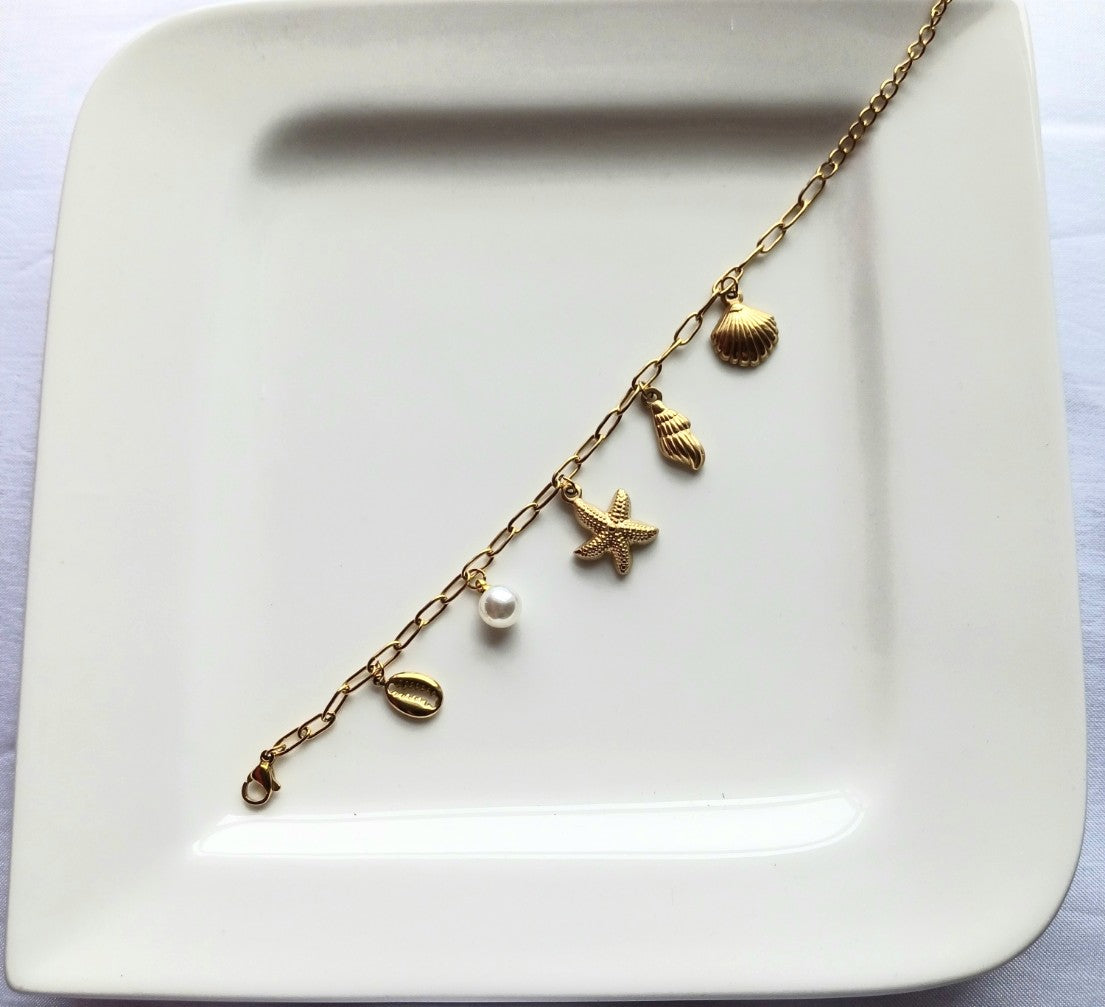 This golden beach charm bracelet features delicate seaside-inspired charms and a lustrous pearl, perfect for carrying a touch of the ocean’s calm and beauty wherever you go.