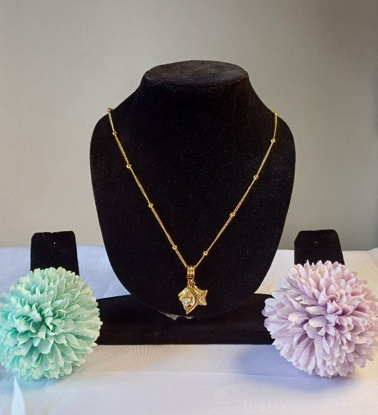 This beach necklace features a delicate golden chain adorned with a charming pendant combining a shell, dolphin, and starfish, accented with sparkling American diamonds. Perfect for those who love the ocean, it adds a touch of seaside elegance to any outfit.