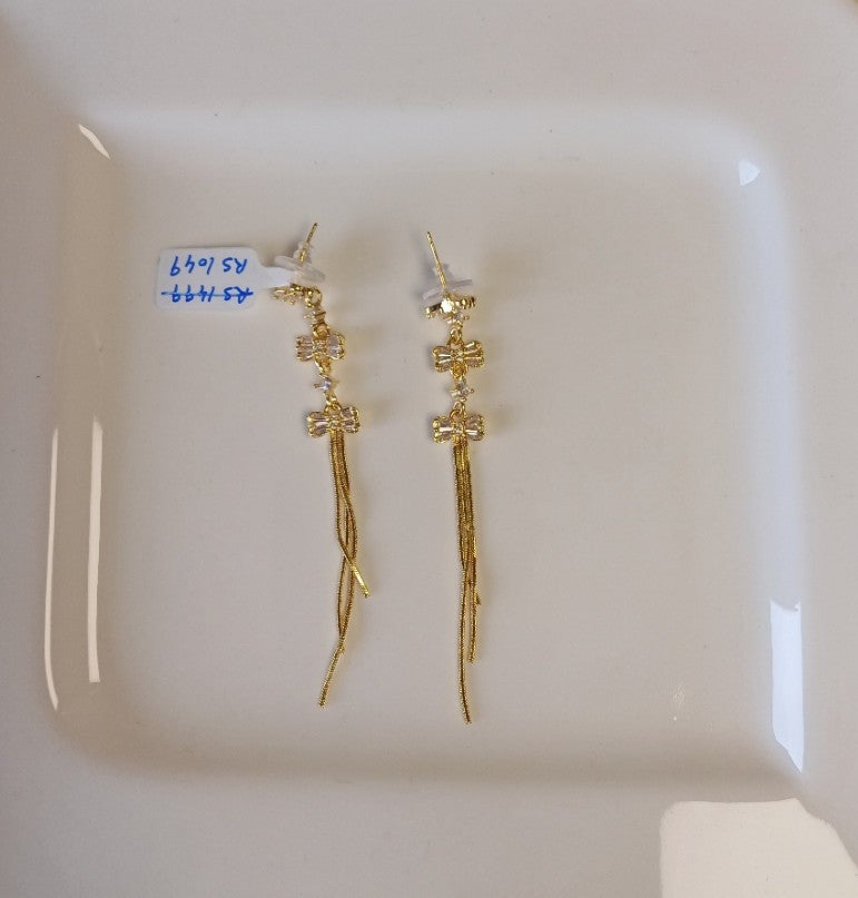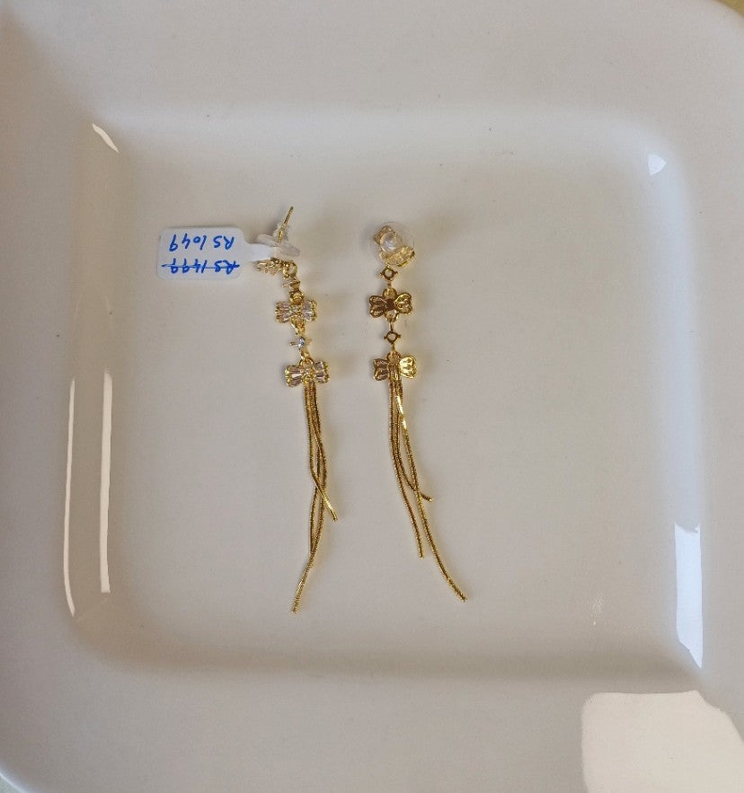 Bow AD Dangler is an elegant Bow-shaped earring adorned with sparkling American diamonds, featuring three delicate golden chains that gracefully dangle below. Perfect for adding a touch of sophistication to any occasion, these charming pieces combine classic design with contemporary flair. Ideal for those who appreciate refined jewelry with eye-catching detail.