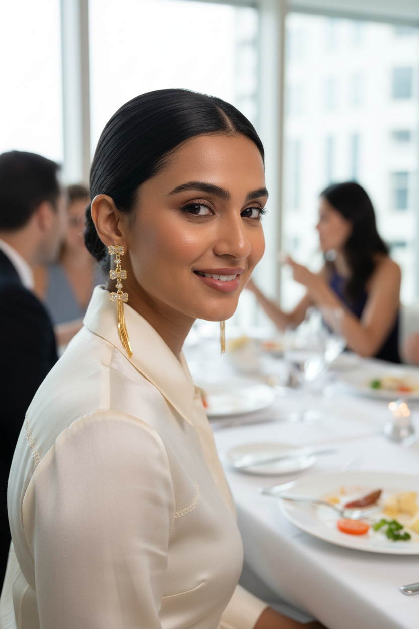 Let the Bow AD Dangler shine by pairing it with a sleek bun or soft waves. Style it with solid satin or silk outfits—think cocktail dresses or elegant sarees—so the bow sparkle and cascading chains stay the star ✨