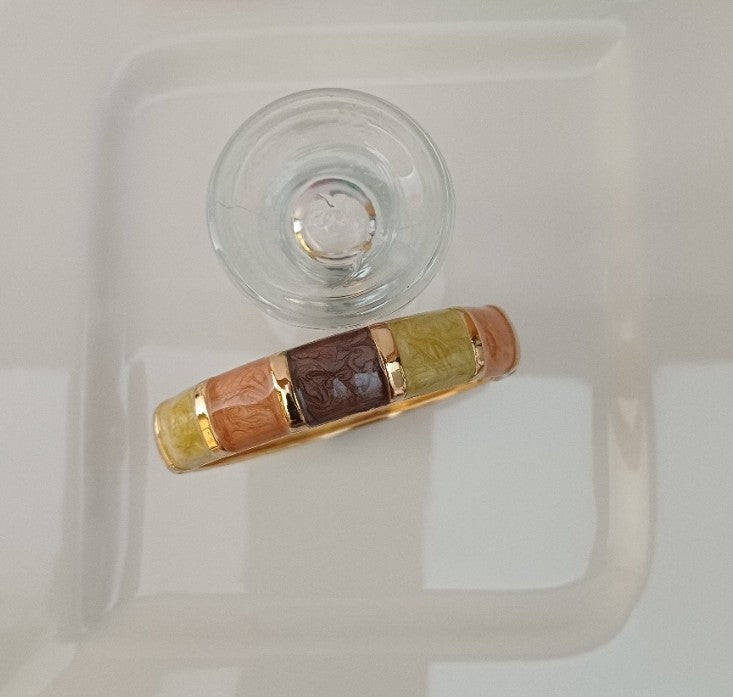 This elegant Brown bangle features a golden base adorned with exquisite Italian Meenakari work in brown, peach, and lemon yellow shades. Its vibrant yet subtle colors make it a versatile accessory, perfect for adding a touch of traditional charm to any outfit. Designed to complement both casual and festive wear, this bangle offers a graceful blend of craftsmanship and style.