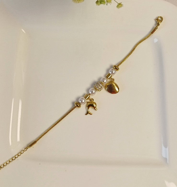 Elevate your style with the Dazzle Bracelet, featuring a golden finish adorned with lustrous pearls and sparkling American diamond embellishments at its center. Delicate dolphin and shell charms add a playful and elegant touch, making it perfect for both casual and special occasions. This bracelet combines charm and sophistication to complement your everyday look effortlessly.