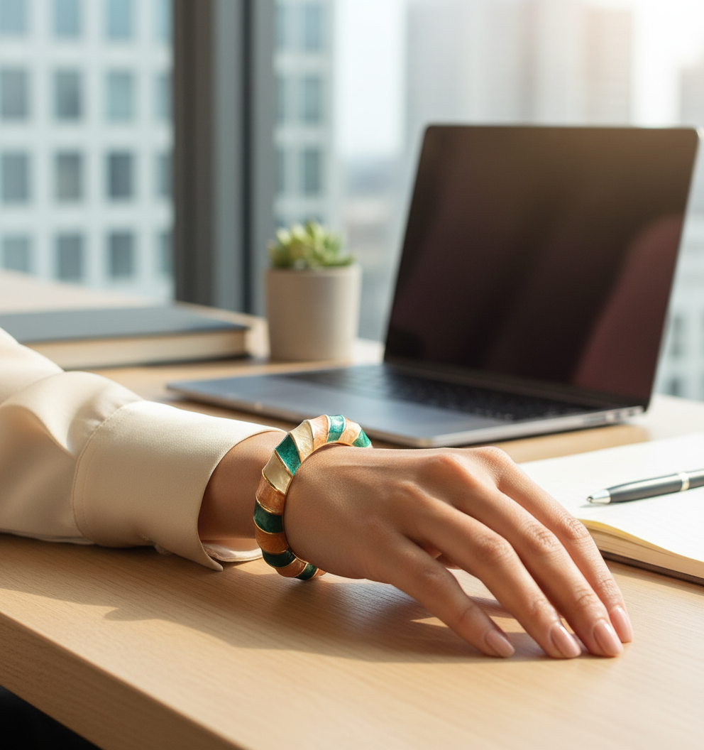 Pair the Earthy Bangle with muted tones like beige, olive, or peach outfits to highlight its Italian Meena enamel and add a touch of natural elegance.