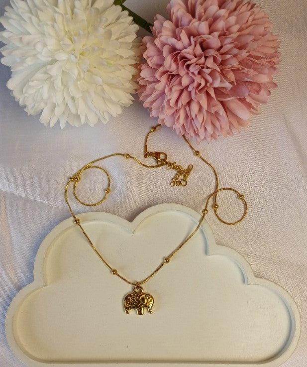 This elegant elephant necklace features a delicate golden chain paired with a charming elephant pendant. Its timeless design makes it a meaningful accessory, symbolizing strength and wisdom, perfect for daily wear or special occasions.