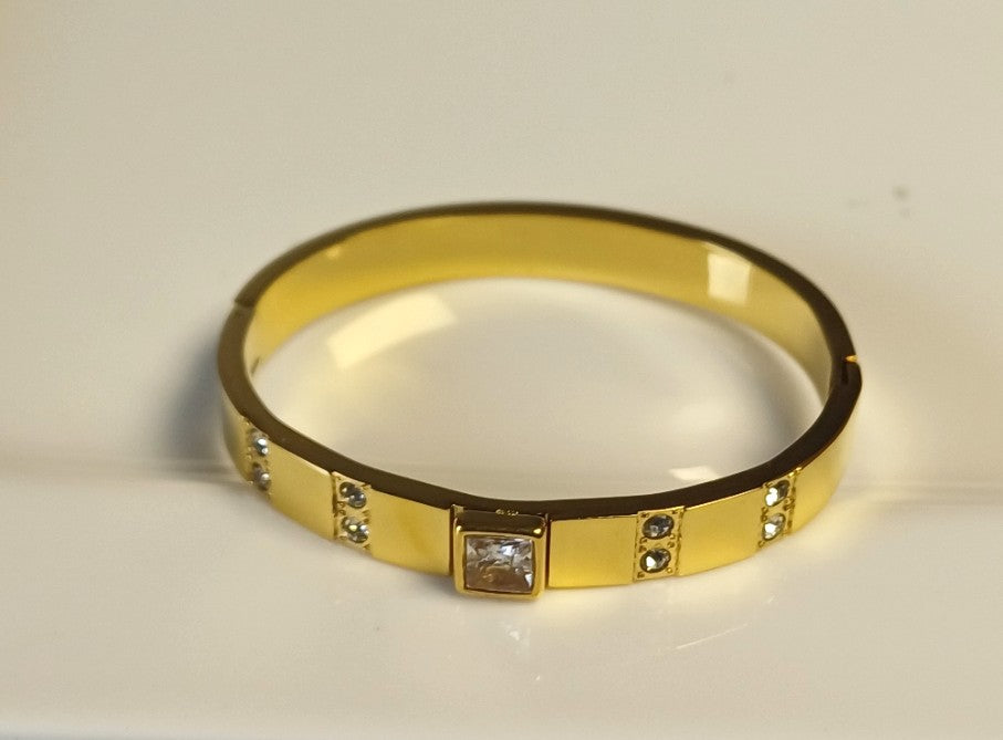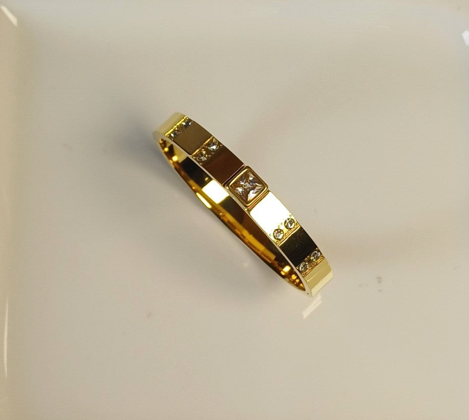The Eliza Bangle combines timeless elegance with subtle sparkle, featuring a golden finish adorned with shimmering American diamonds. This piece adds a graceful touch to any outfit, perfect for both everyday wear and special occasions. Its delicate design ensures comfort while enhancing your natural charm.