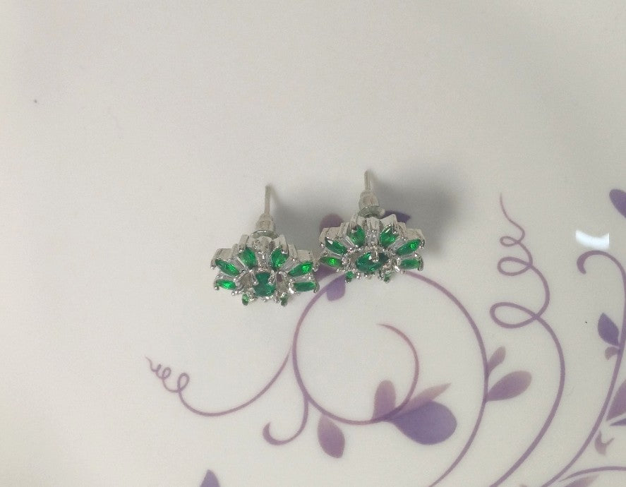 These Emerald AD Stud earrings blend elegance with a unique design. Crafted in silver, round flower-shaped stud sparkles with American diamonds, featuring alternating green stones that add a fresh, vibrant touch. Perfect for enhancing everyday looks or special occasions, they offer a subtle yet charming statement.
