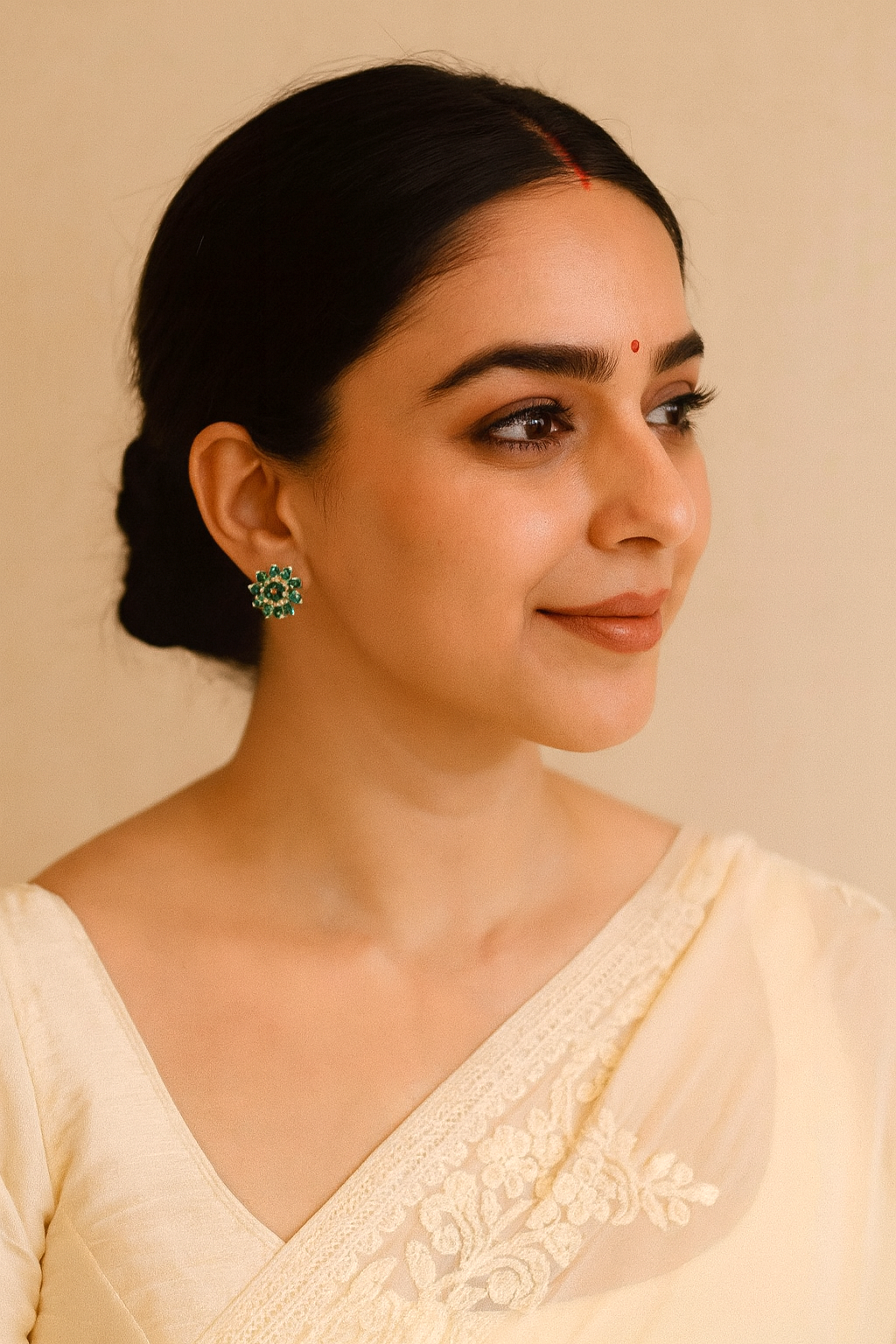 Pair the Emerald AD Stud earrings with a classic white chiffon saree or an emerald green satin blouse, letting the green stones pop beautifully. Add a sleek bun or soft curls to highlight their sparkle and elegance.