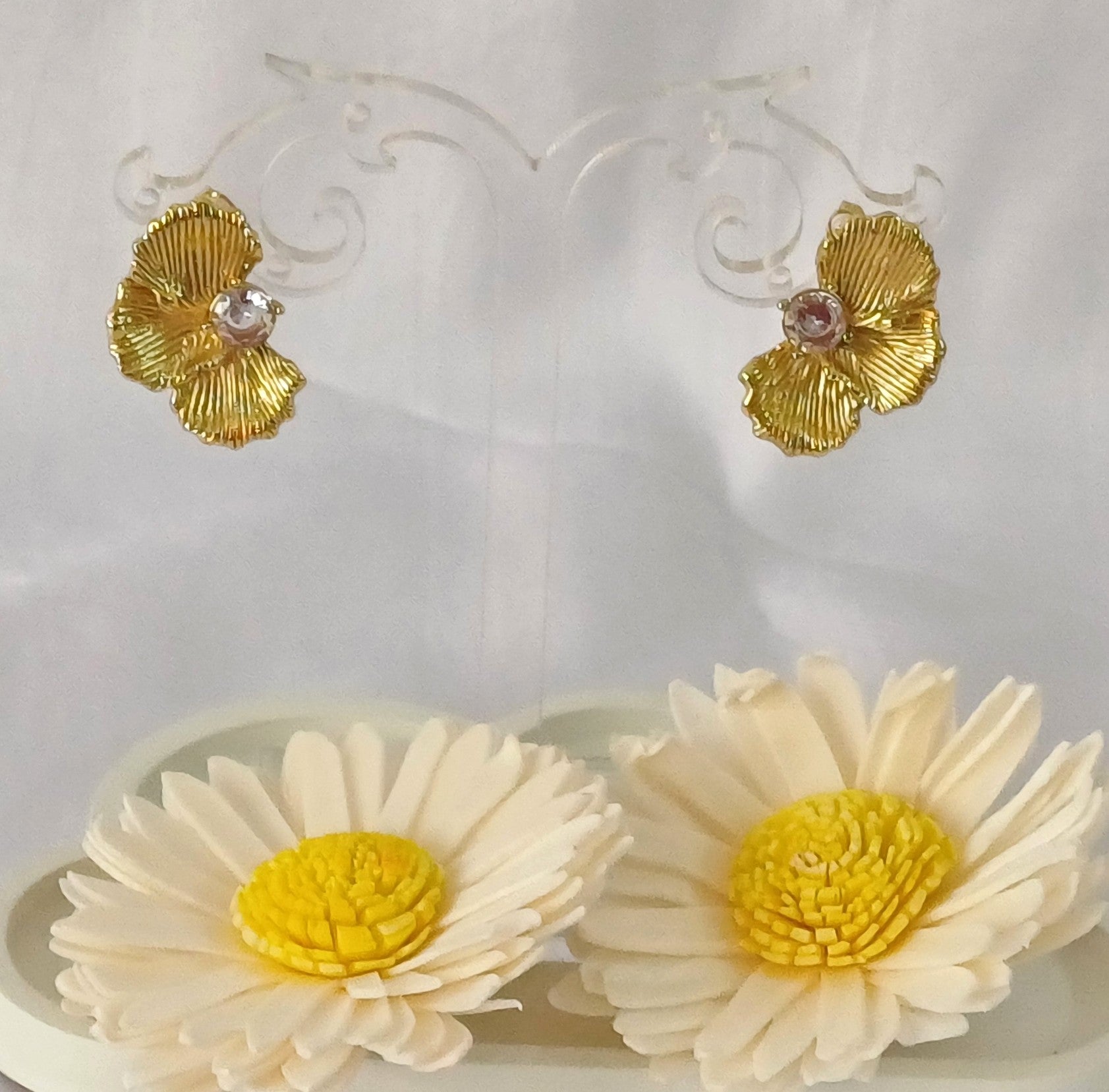 Golden Half Flower AD Studs: Elegant half-flower design with a golden finish, featuring a vibrant American diamond center stone. Perfect for adding a subtle yet striking touch to any outfit.