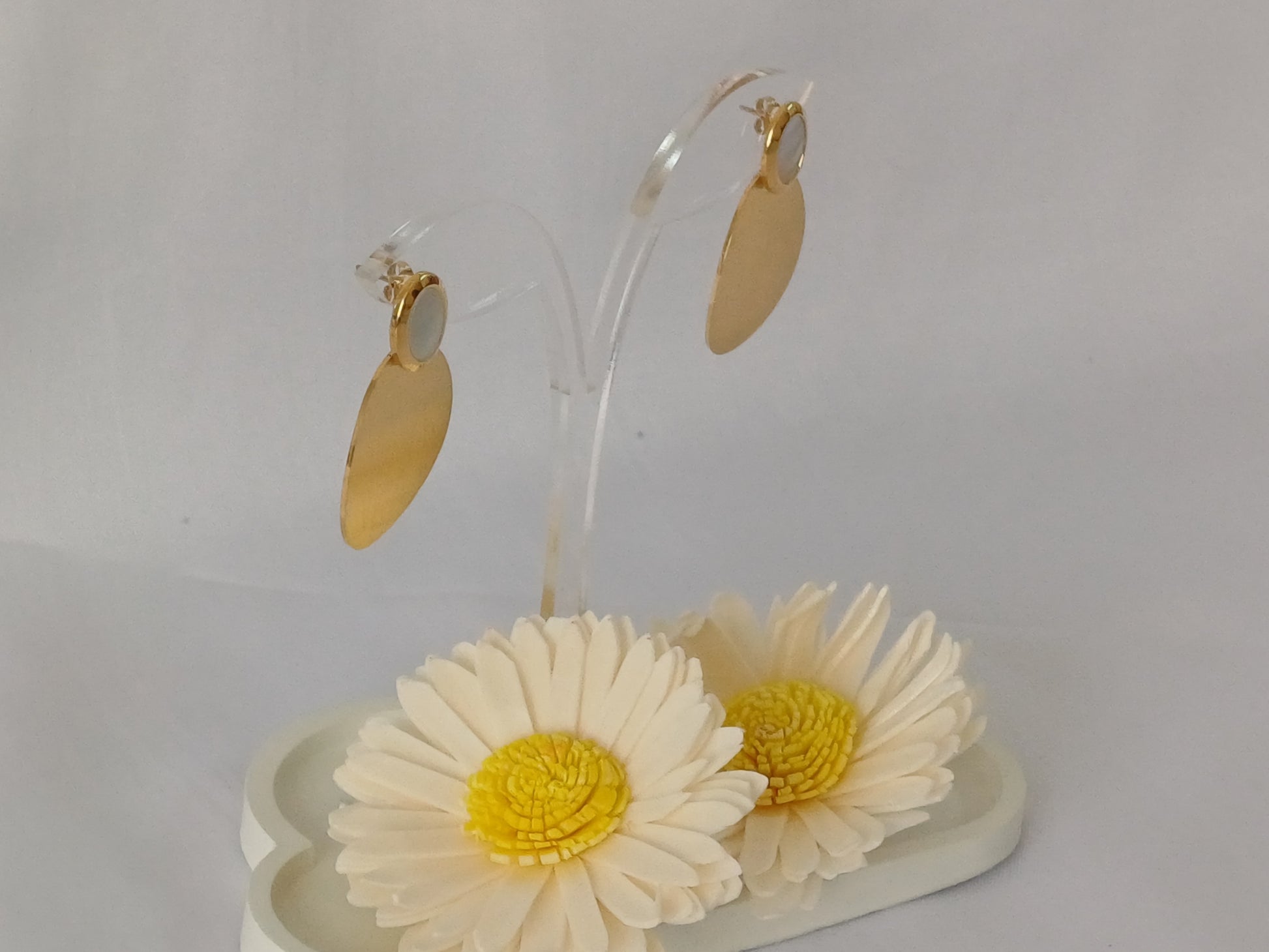 The Golden Oval Drop Earrings with Mother of Pearl feature an elegant, timeless design. The smooth, luminous Mother of Pearl is set within a warm gold-toned oval frame, creating a sophisticated contrast. Perfect for adding a touch of luxury and charm to any outfit.