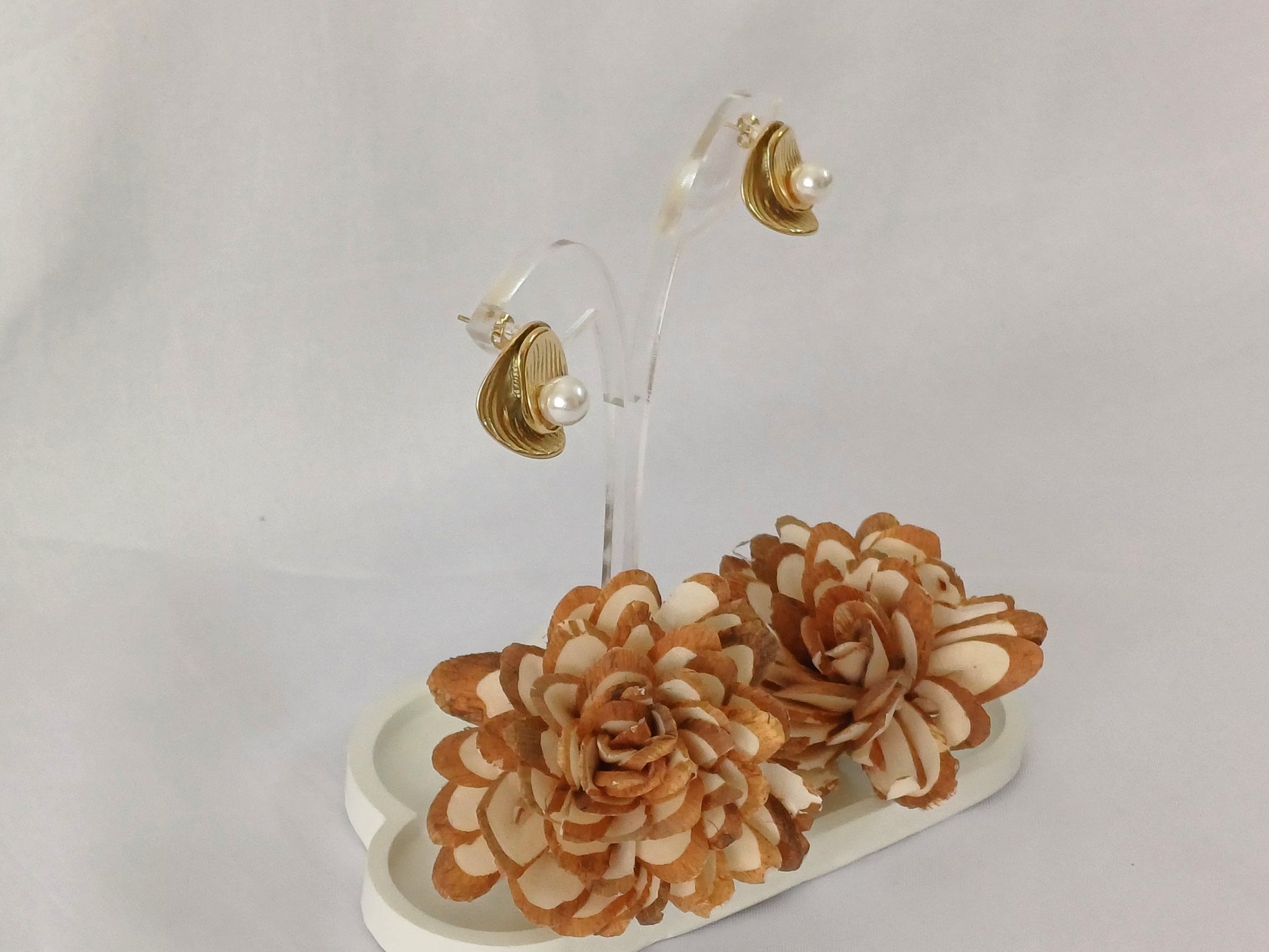 Golden Pearl Stud Andrea: Elegant and timeless, these earrings feature lustrous pearl delicately framed by a subtle patterned design. Perfect for adding a touch of sophistication to any look.