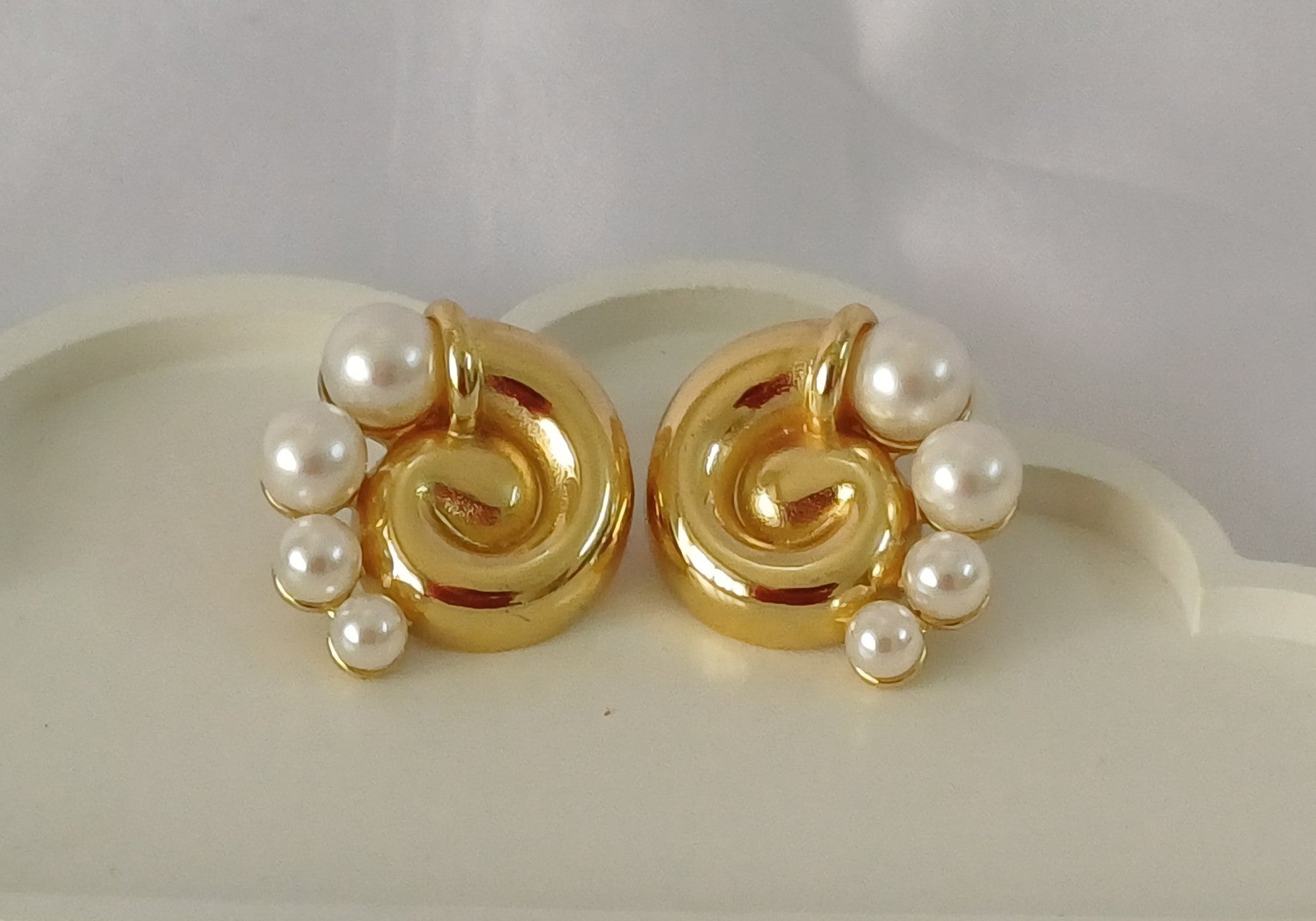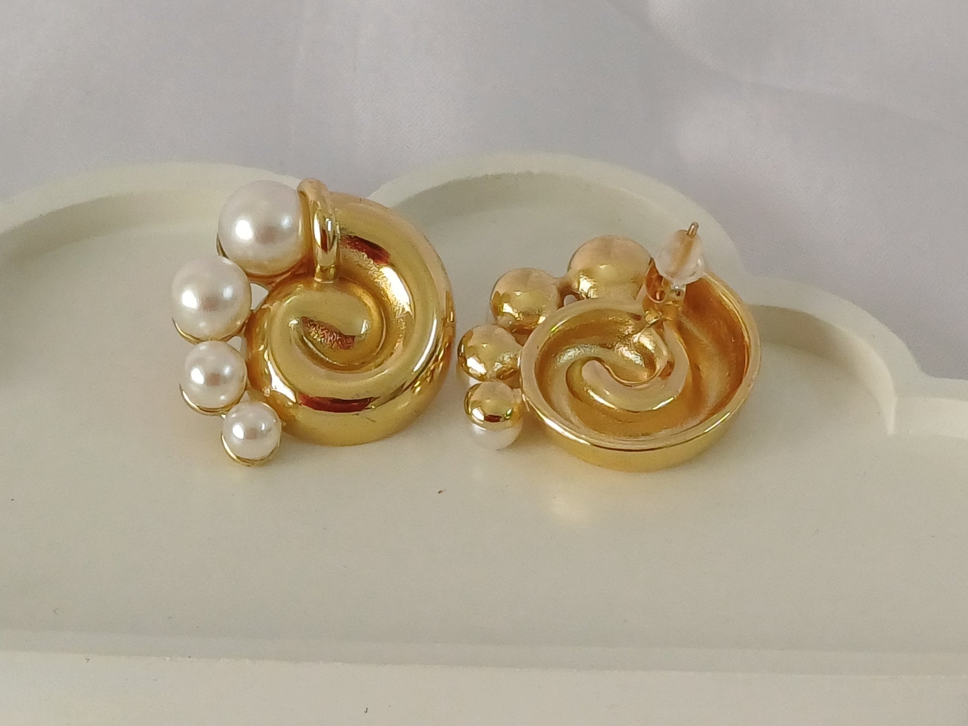Elegant and unique, the Golden Stud Annie features a delicate trumpet shape with lustrous pearl ends. Perfect for adding a touch of sophistication to both casual and formal outfits.