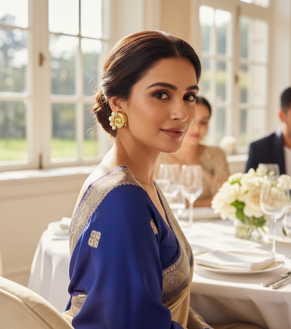 Pair the Golden Stud Annie earrings with an off-shoulder top or a flowy midi dress to highlight their graceful trumpet shape and pearl accents. Perfect for a classy, feminine look!