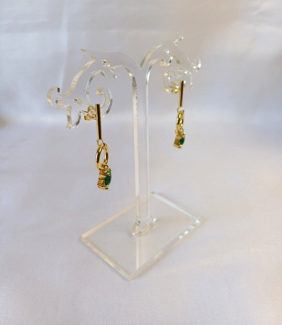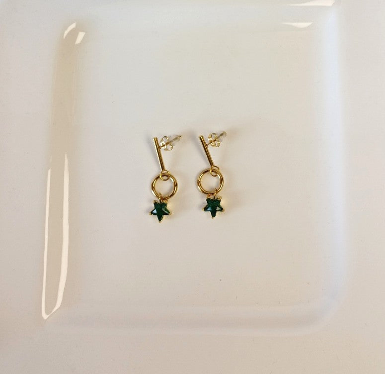 The Green Star Drop features a sleek golden stick design accented with a delicate circle drop and a star, highlighted by a vibrant green stone. This elegant piece adds a subtle touch of color and charm, perfect for enhancing your everyday style.