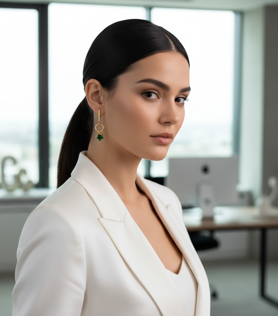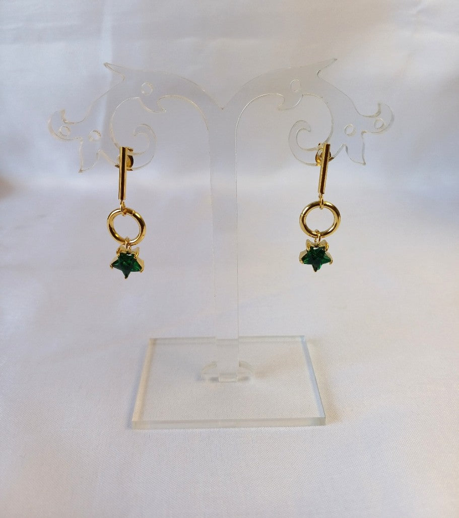 Pair the Green Star Drop earrings with a sleek black or emerald outfit to let the vibrant green stone pop—perfect for adding a chic, modern touch to both day and evening looks. ✨🌿