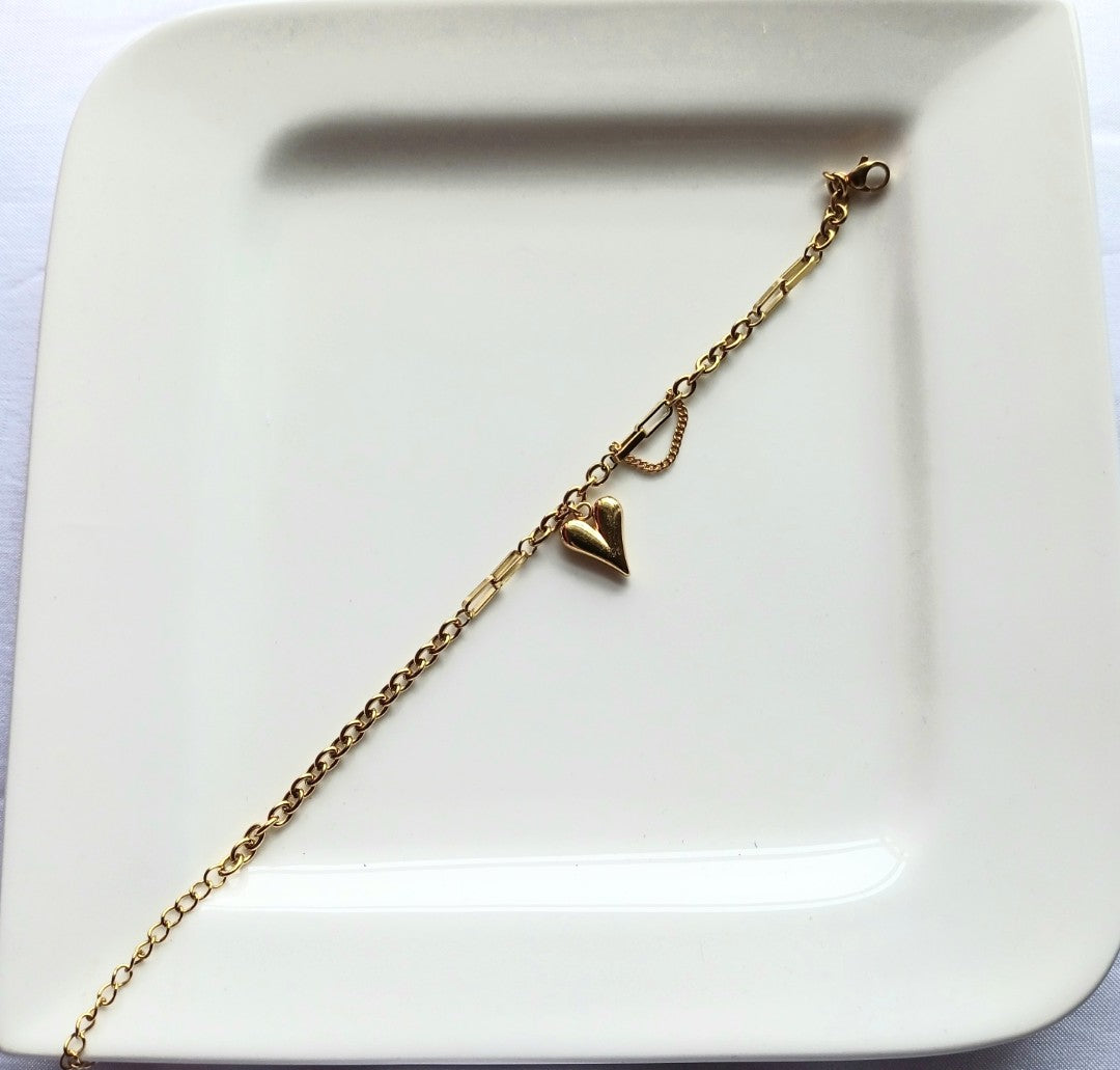 This elegant heart bracelet features a sleek golden heart at its center, symbolizing love and connection. Its delicate design makes it a perfect everyday accessory.
