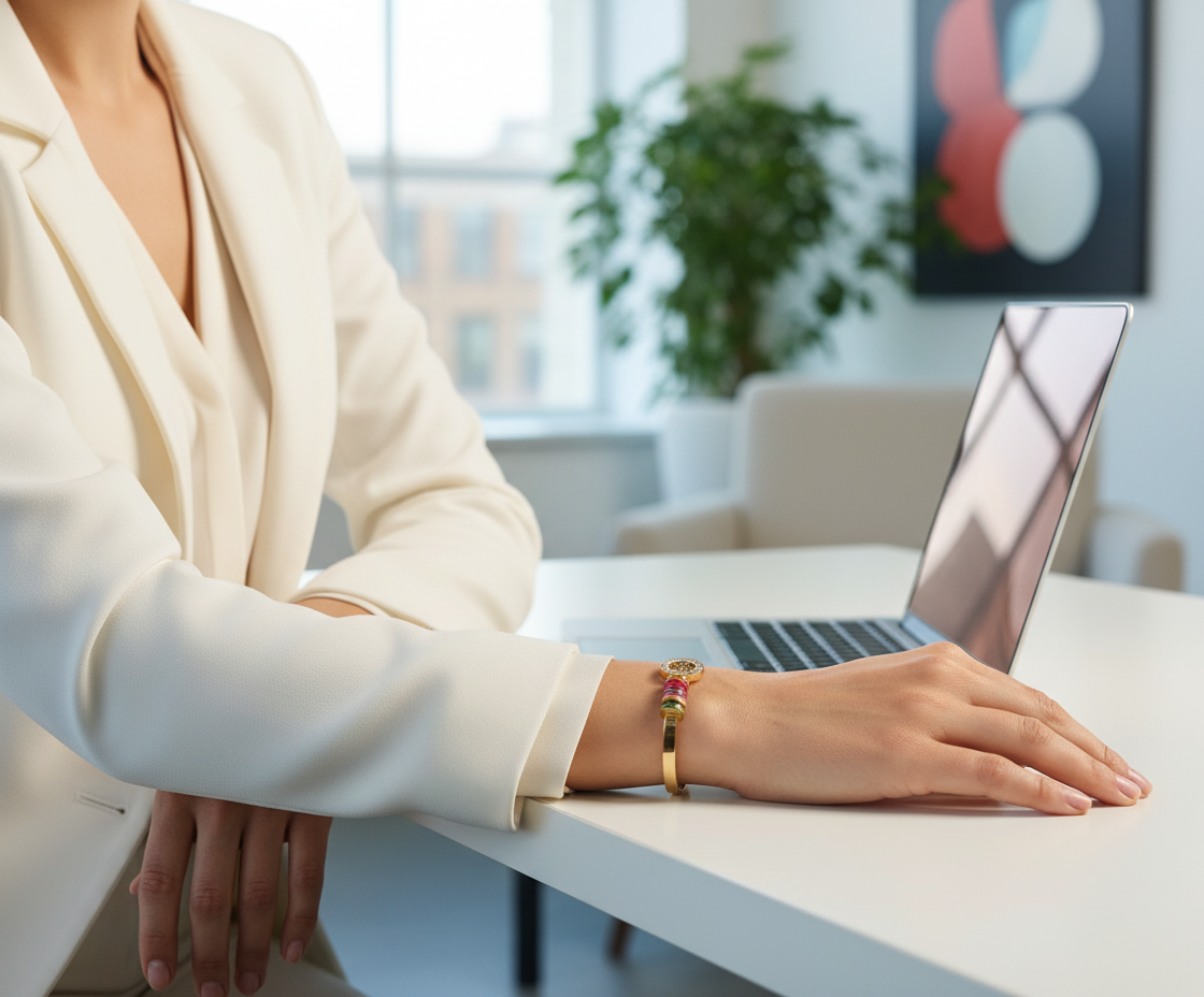 Style the Kaira Bangle with a flowy pastel kurta or a white chiffon saree to let the golden tree motif and colorful accents pop—perfect for festive brunches or intimate gatherings.