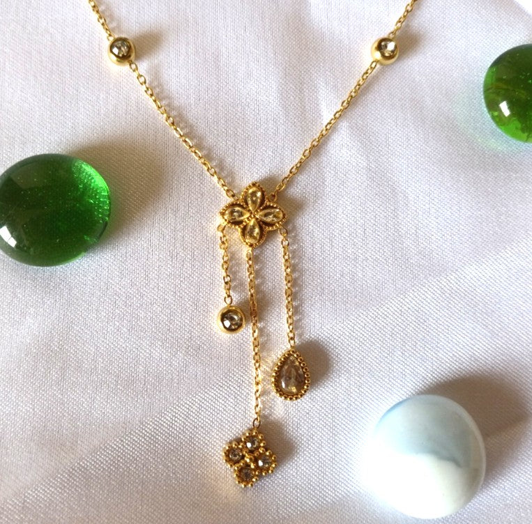 The Lauren Necklace is a delicate beauty featuring a dainty golden chain adorned with sparkling American diamonds at intervals. At the center, three elegant chains cascade gracefully, each accented with dazzling AD embellishments, adding a touch of sophistication and charm. Perfect for elevating any look with effortless elegance!