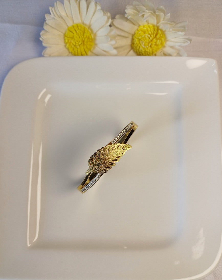 This elegant Leaf Bangle features a golden finish with a delicate leaf design at its center, beautifully accented by sparkling American diamonds on both sides. Its refined craftsmanship makes it a perfect accessory to enhance your everyday look or add a touch of sophistication to special occasions. Comfortable to wear and versatile, this bangle is designed to complement your style effortlessly.