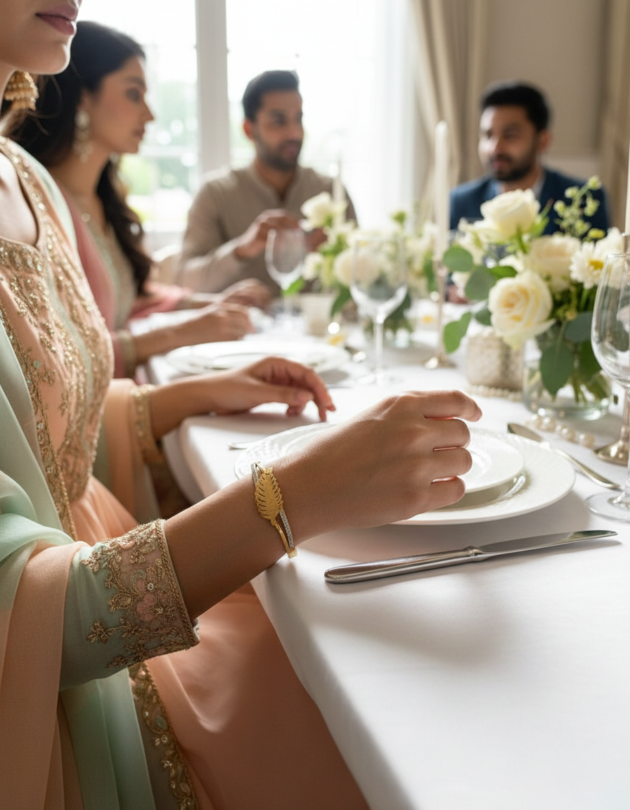 Pair the Leaf Bangle with flowy fabrics like chiffon or georgette in earthy tones—think olive green, beige, or ivory—for a graceful, nature-inspired look. Perfect with sleeveless or 3/4th sleeve outfits to let the bangle shine.