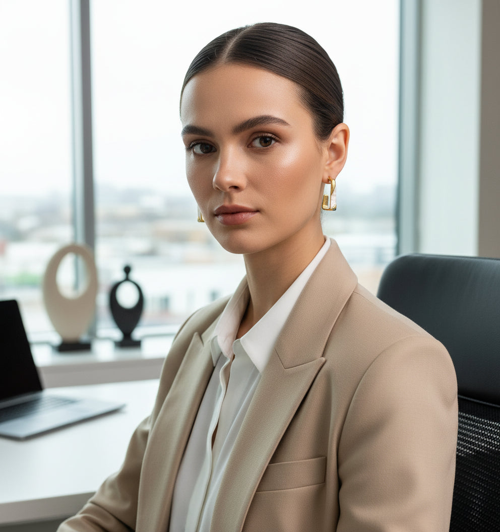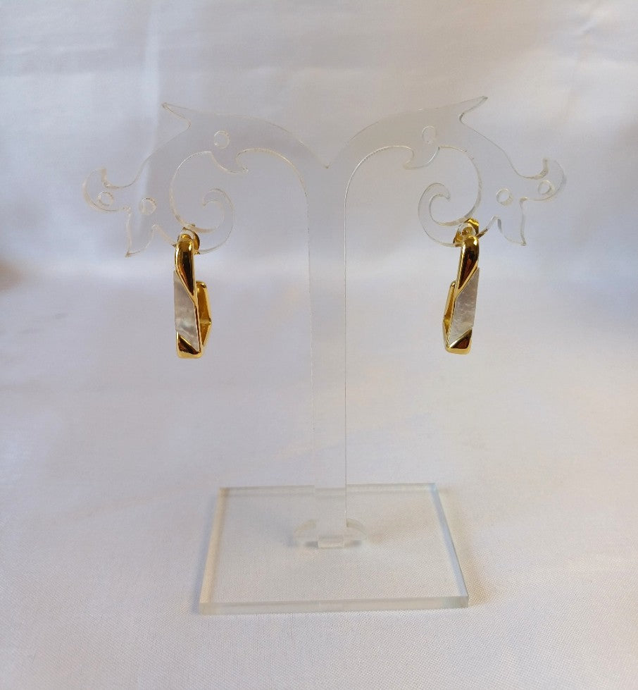 Pair the MOP C Hoop earrings with a crisp white shirt or pastel blouse to let the golden finish and mother of pearl detail shine with effortless elegance.