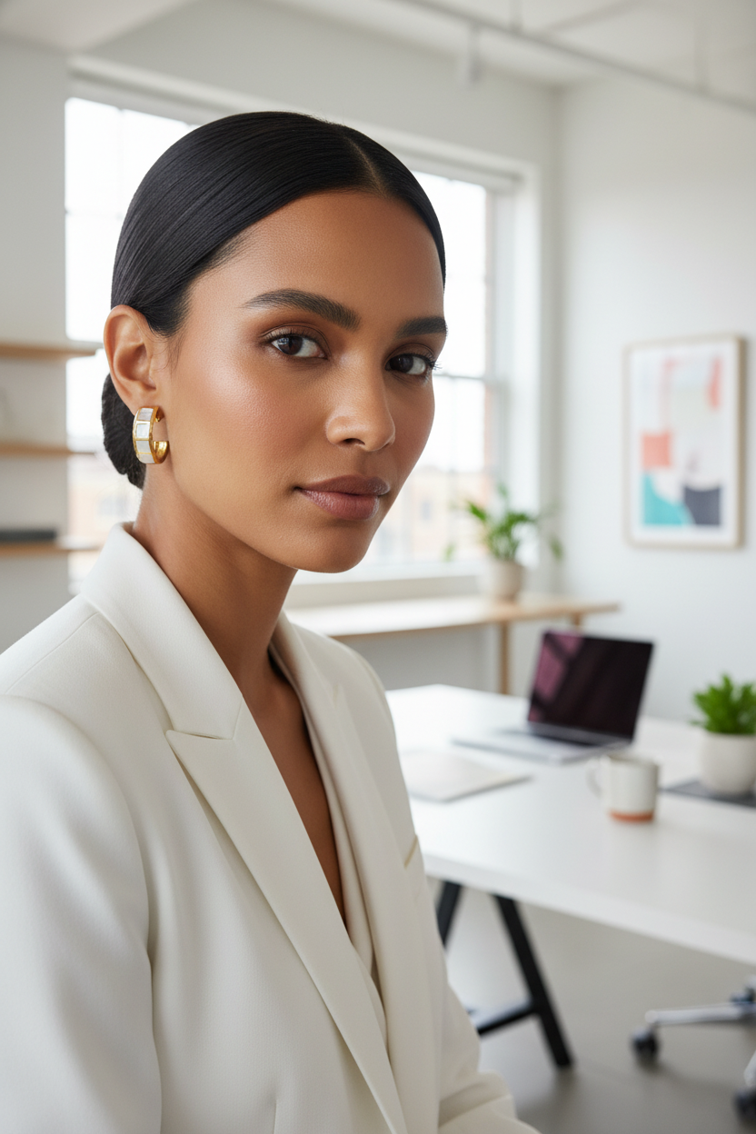 Let the MOP Hoop shine by pairing it with neutral or pastel outfits—think ivory kurtas, beige co-ords, or soft florals. The mother-of-pearl inlay reflects light beautifully, so keep makeup fresh and hair in a sleek bun or soft waves to highlight its elegant glow. Perfect for effortless day-to-evening styling ✨