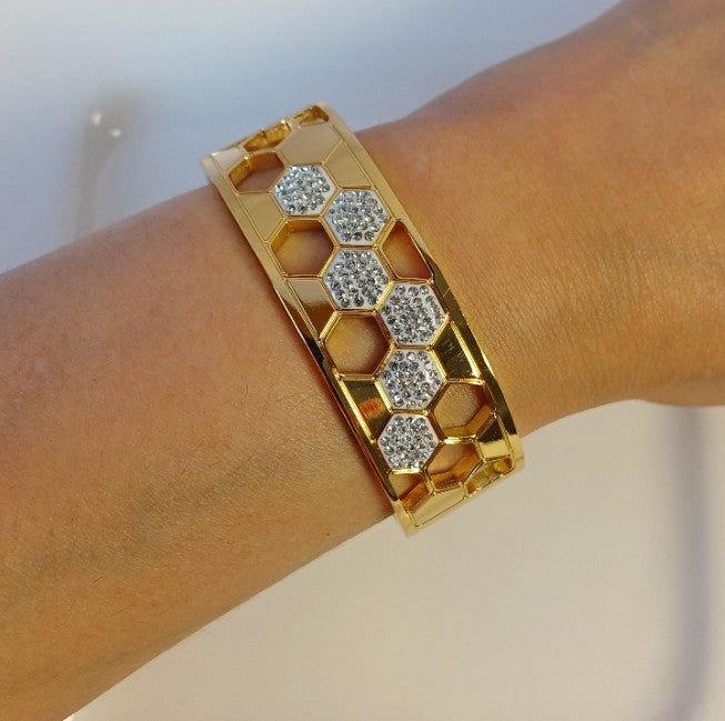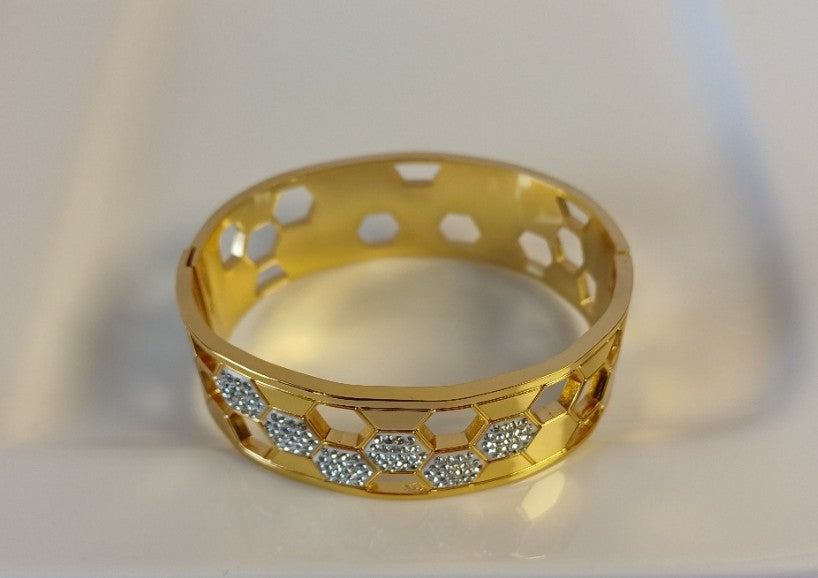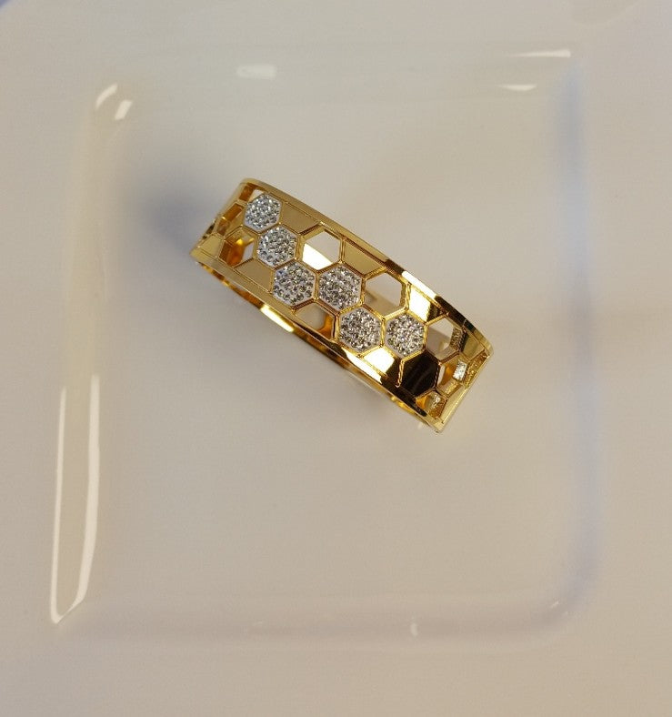 The Natalie Bangle features a broad golden band adorned with a delicate hexagon pattern encircling it. At its center, shimmering American diamonds add a refined sparkle. This elegant piece blends classic design with subtle brilliance, perfect for enhancing your everyday or special occasion look.