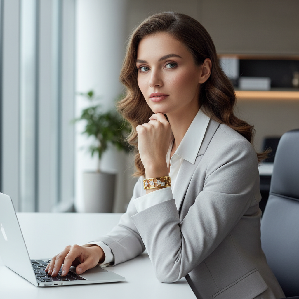 Pair the Natalie Bangle with a sleek watch or minimal rings to let its bold hexagon pattern and diamond sparkle stand out effortlessly.