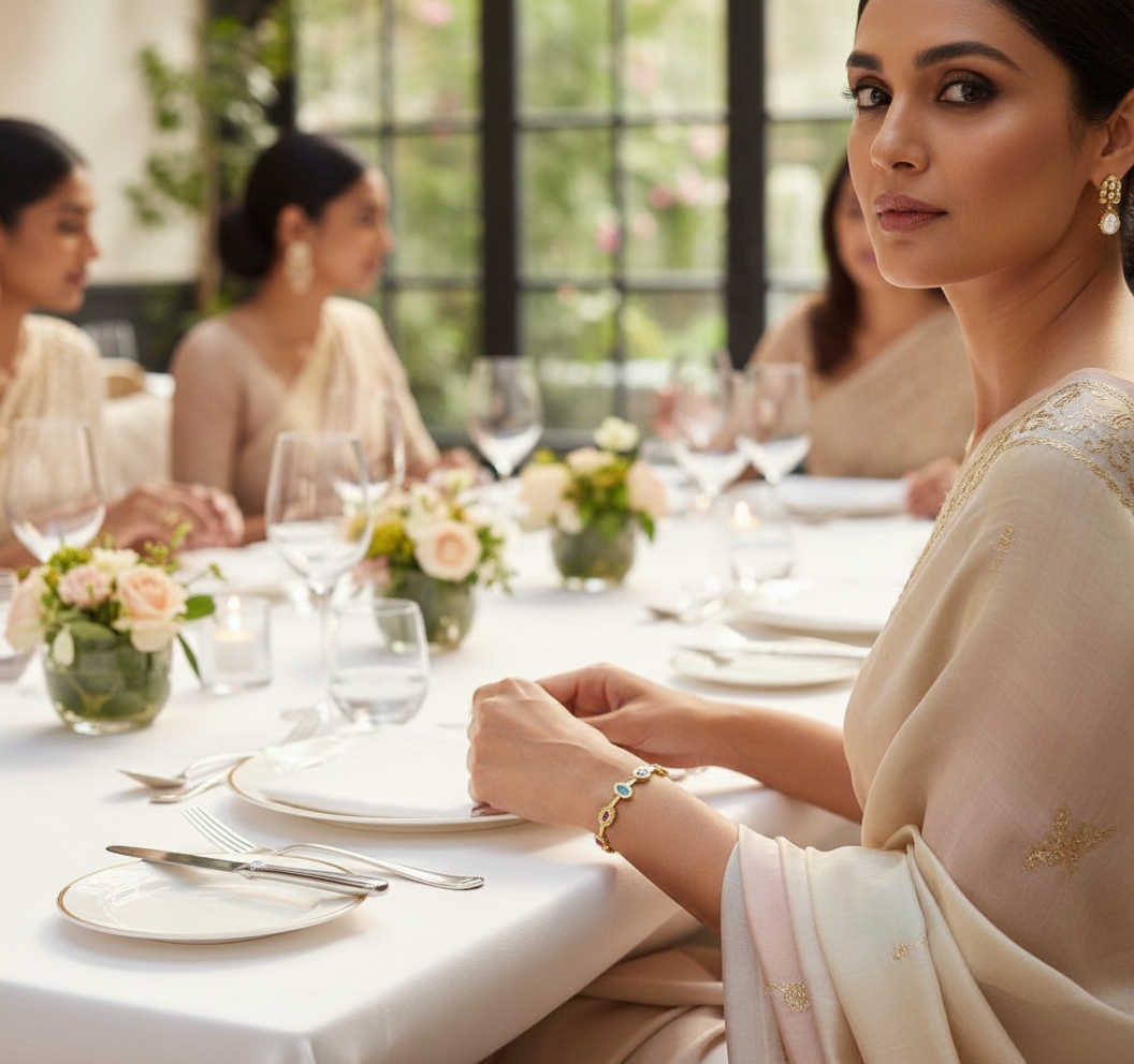 Pair the Noor Bracelet with a breezy pastel kurta or a chic summer dress to let its colourful stones add a playful pop to your look.
