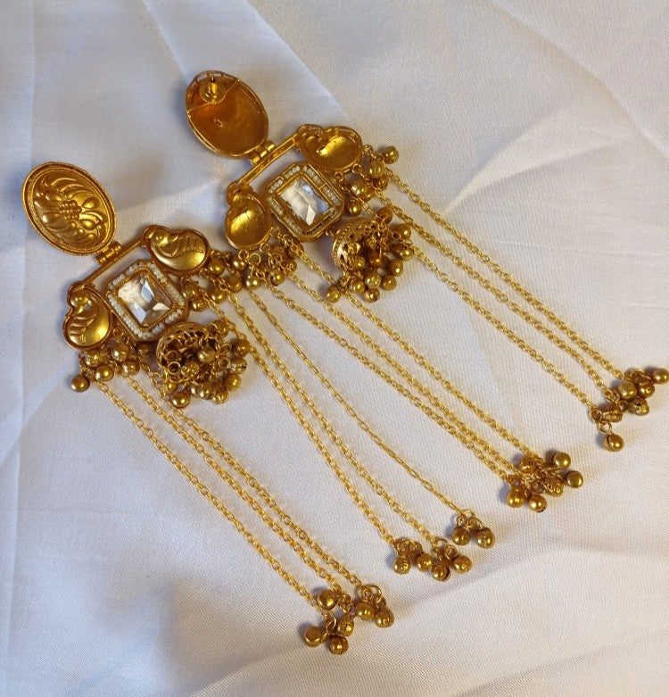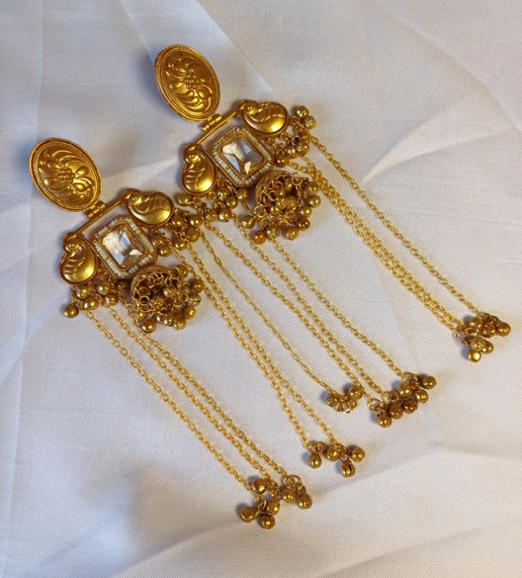 Elevate your elegance with these stunning peacock earrings, a true celebration of timeless beauty. Each exquisite dangler features an intricately designed peacock motif with a radiant stone centerpiece, complemented by a delicate jhumka below. Three graceful golden chains cascade from each side, creating a mesmerizing movement that catches light with every turn of your head. Perfect for special occasions or adding a touch of sophistication to your everyday look, these earrings blend traditional artistry with contemporary charm.