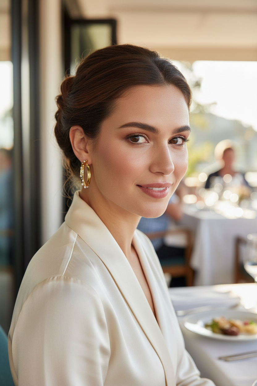 Style the Pearl hoops with a soft satin or chiffon outfit in pastel or ivory shades for daytime grace, or pair them with a sleek evening dress or silk saree for a refined night look. Keep your neckline minimal and opt for a low bun or soft waves so the hoops truly shine.