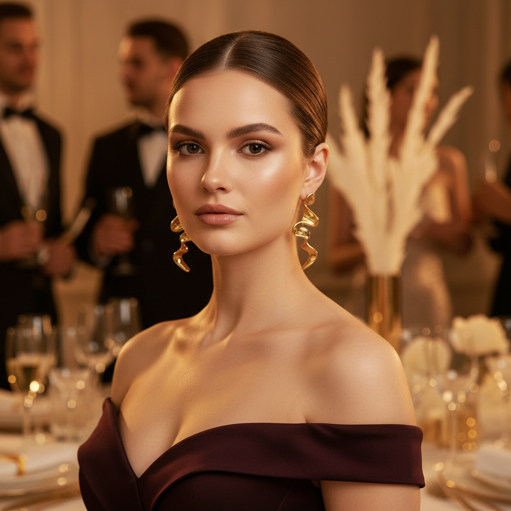 Pair the Raya danglers with a sleek off-shoulder blouse or a structured blazer to let the bold lines of the earrings shine. Keep your neckline clean to highlight their modern edge.