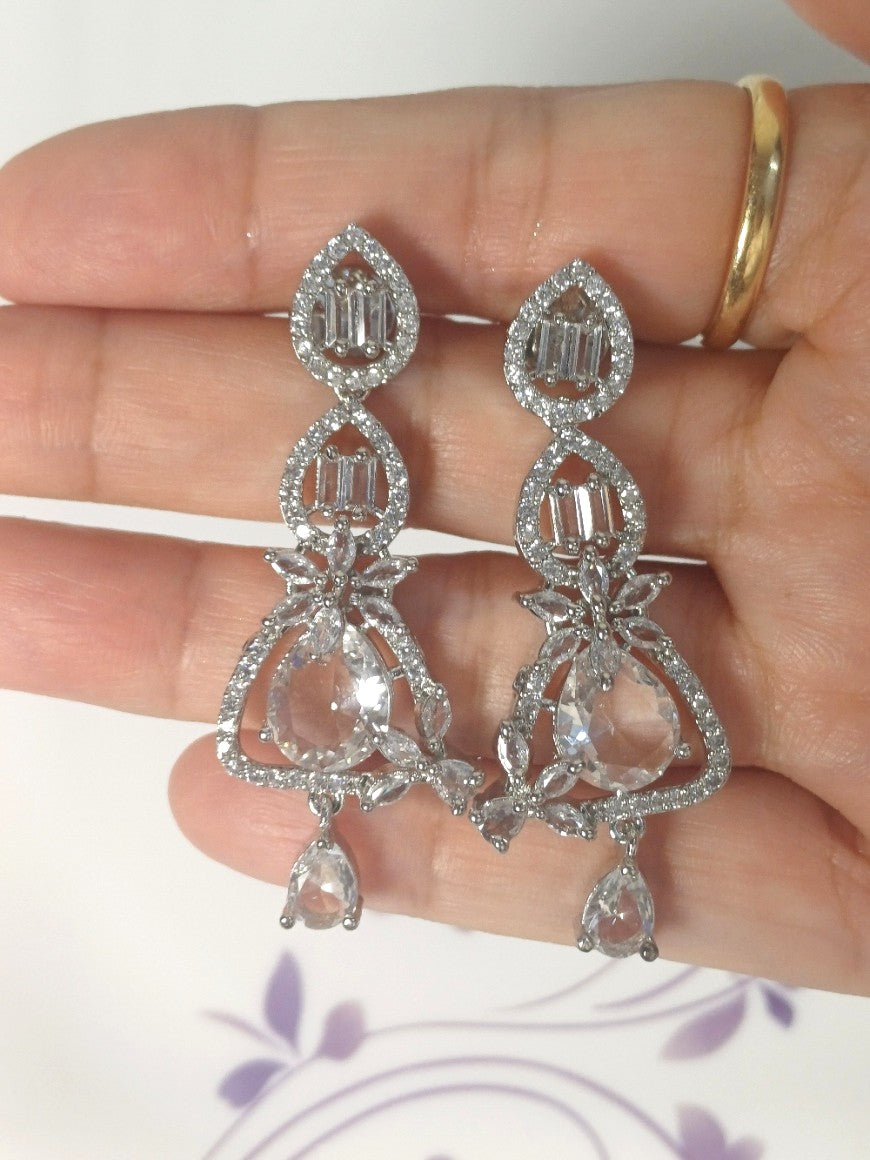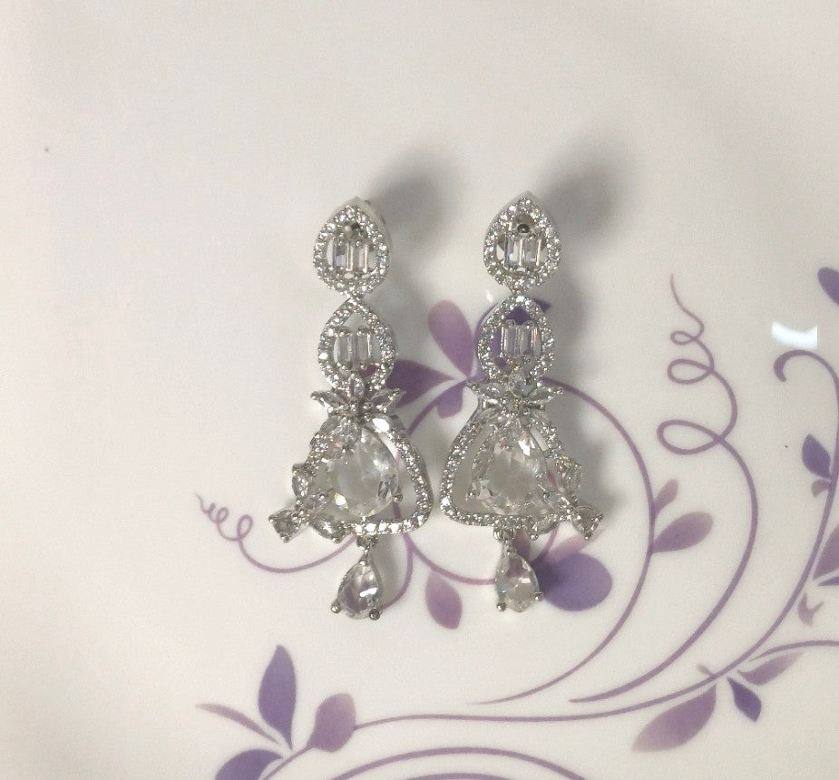The Reva AD Dangler features a sleek silver design adorned with sparkling American diamonds, adding a touch of elegance to any outfit. Its lightweight construction ensures comfortable wear, making it perfect for special occasions.