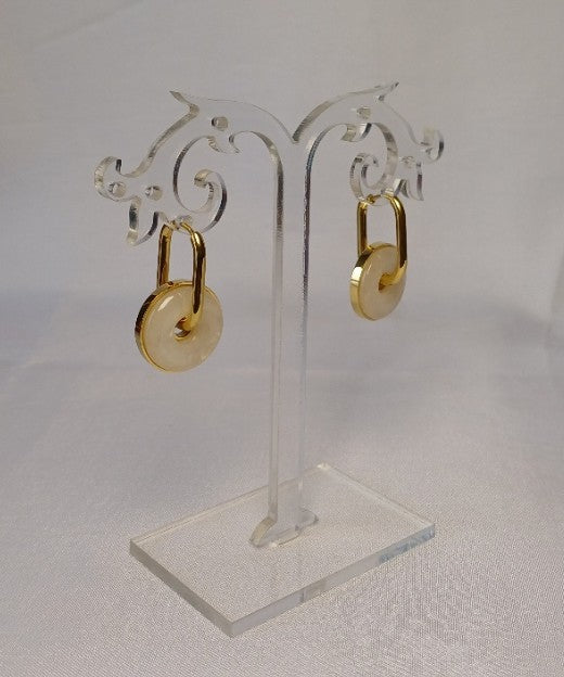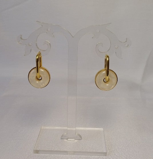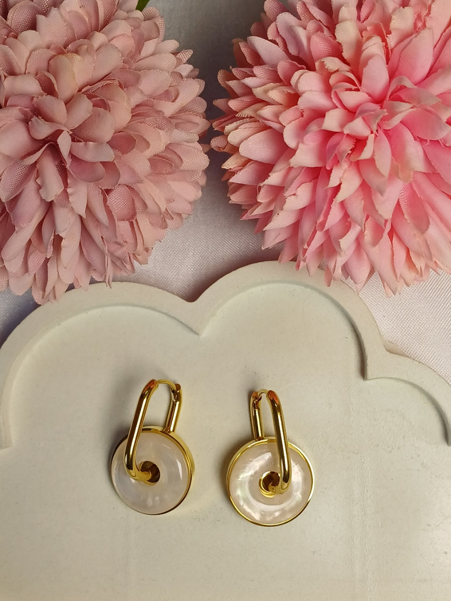 These elegant earrings feature a rectangular golden hoop accented by a round mother of pearl drop framed in a delicate golden border. The combination of warm gold tones and the iridescent mother of pearl creates a timeless accessory that complements any outfit with subtle sophistication.