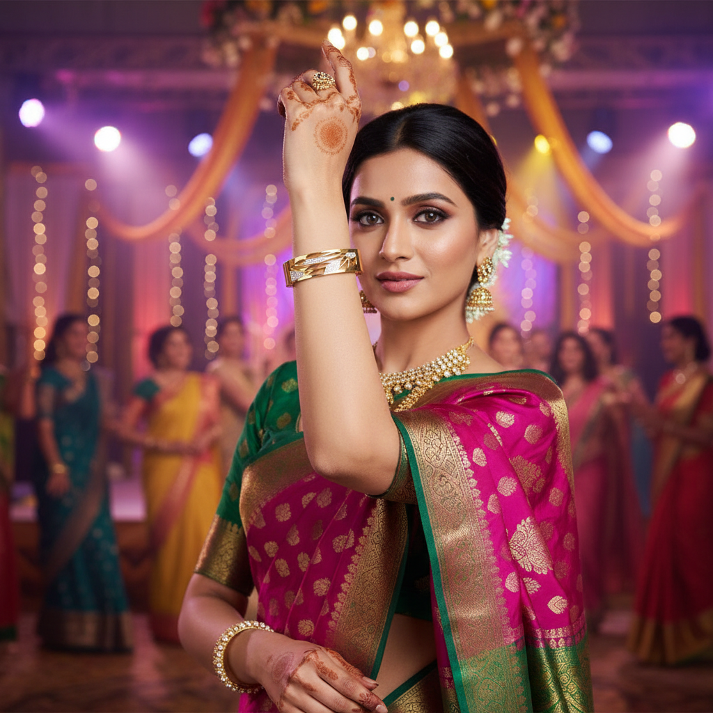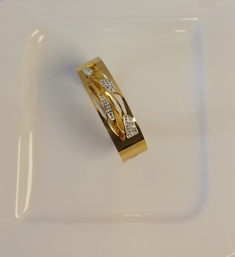 The Sage Bangle combines timeless elegance with modern flair, featuring a golden finish adorned with sparkling American diamond embellishments. Its contemporary design adds a subtle yet striking touch to any outfit, making it a versatile piece for everyday wear or special occasions. This bangle offers a refined look that complements your style effortlessly.