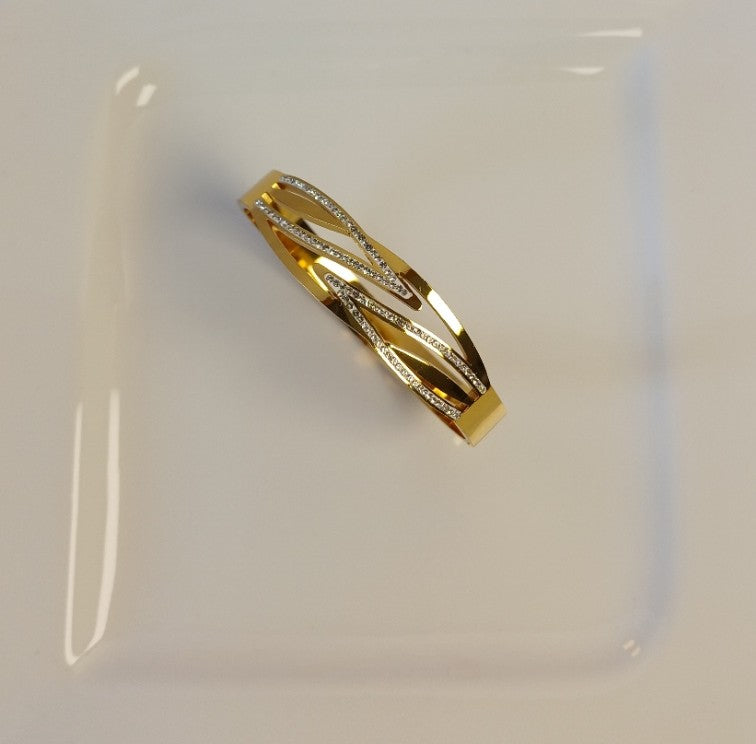 The Sarah Bangle features a graceful leaf design adorned with sparkling American diamonds, offering a subtle golden shimmer. This elegant piece enhances any outfit with its delicate charm and timeless appeal, making it a perfect accessory for daily wear or special occasions.