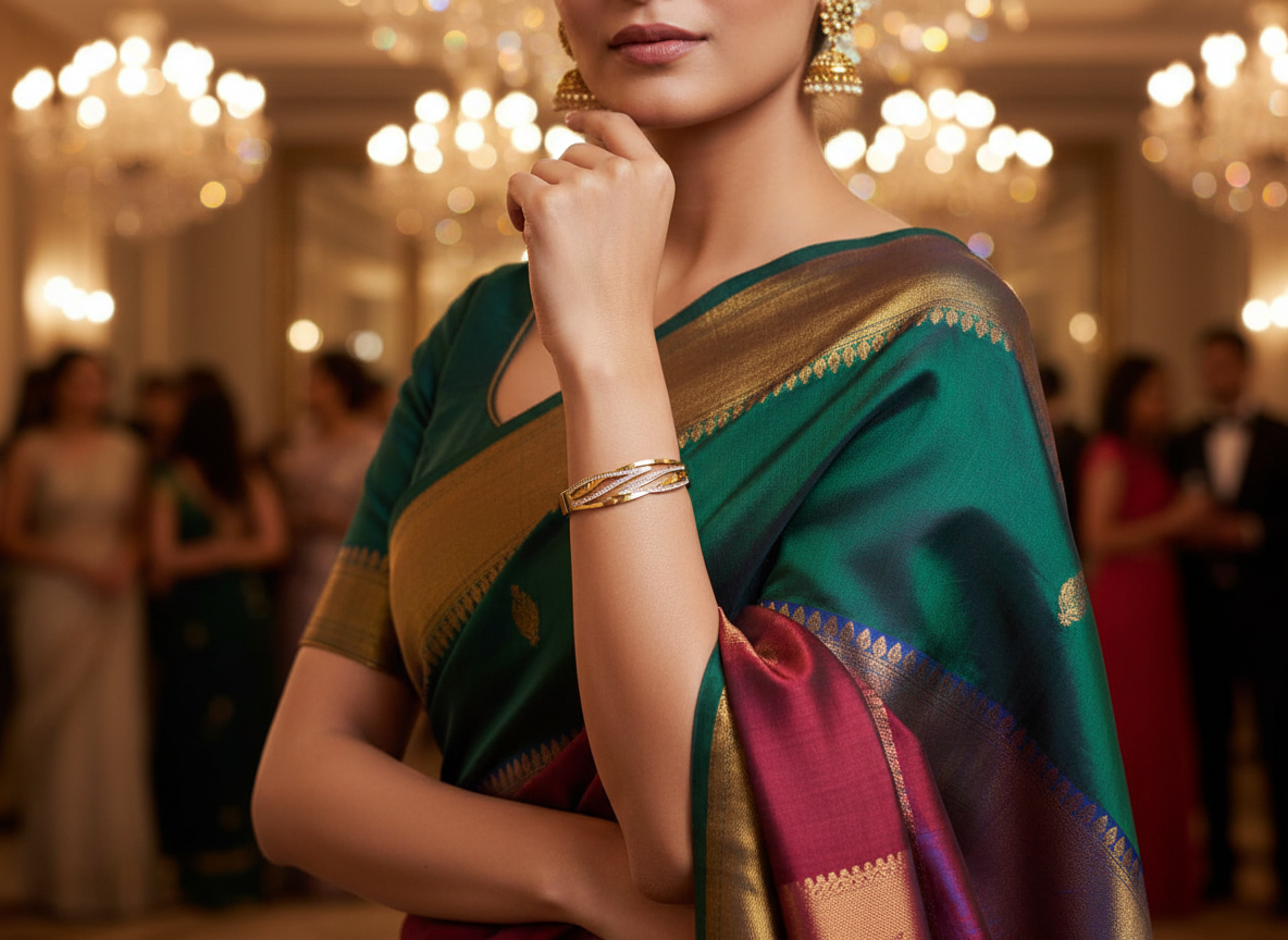 Pair the Sarah Bangle with a flowy dress or saree to highlight its elegant leaf design—perfect for adding sparkle to both festive and evening looks. ✨🌿