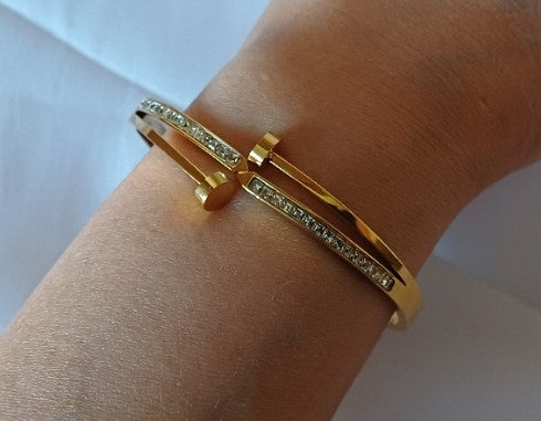 The Sasha Bangle is a bold yet elegant statement piece, featuring a sleek nail design encrusted with sparkling American diamonds. Perfect for adding a touch of edgy sophistication to any look!