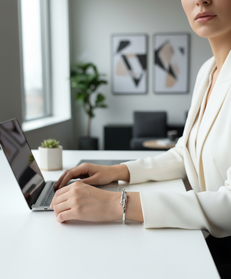 Stack your silver bamboo bangle with a sleek watch or minimalist cuffs for an effortlessly chic, layered look—perfect for both casual and office wear.