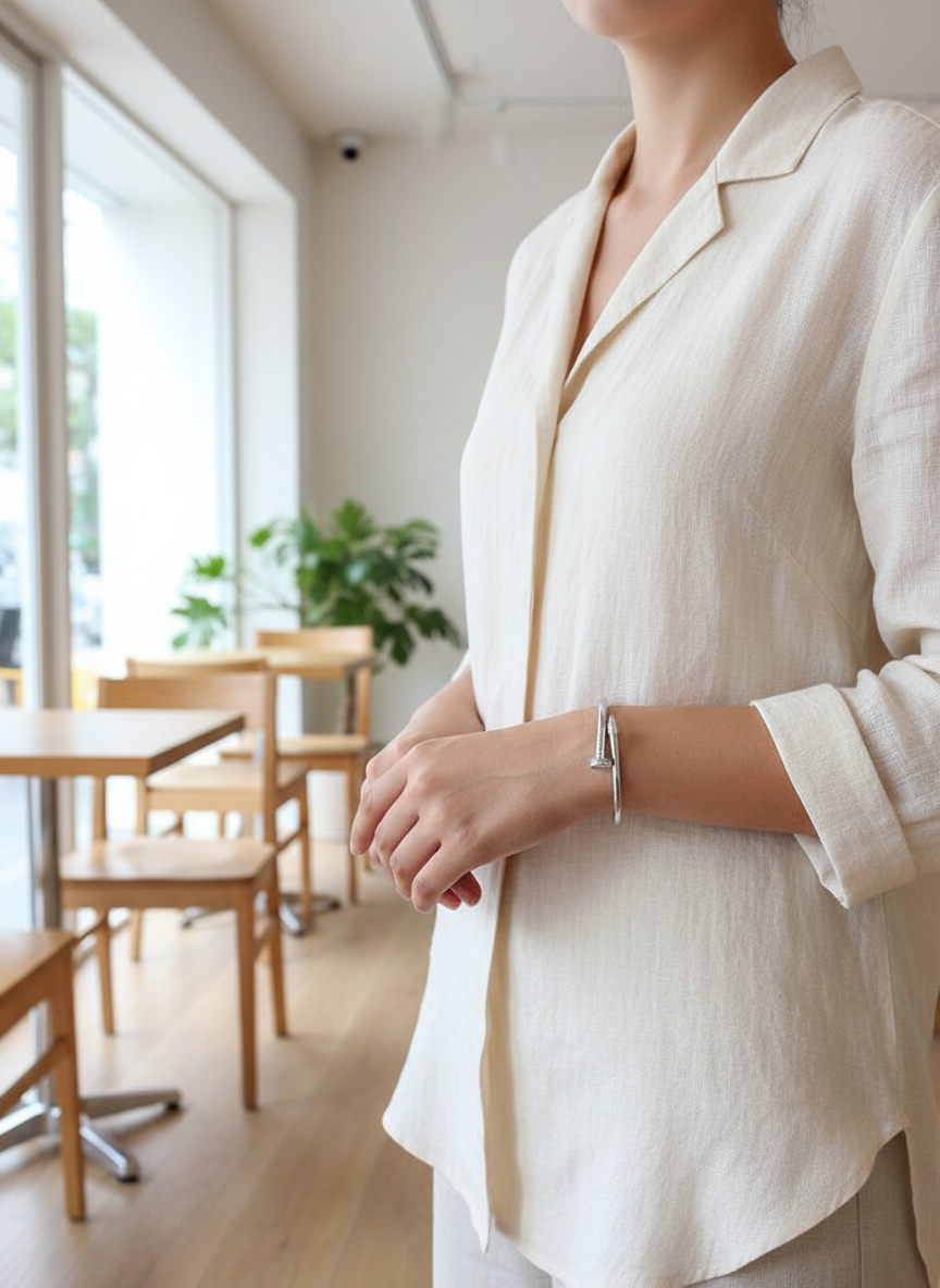 Pair your silver nail bangle with a chic monochrome outfit—think a sleek black dress or a white blazer with denim—for a bold yet sophisticated look. Let the bangle shine by keeping other accessories minimal! ✨