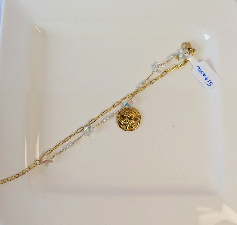 The Sitara Bracelet combines delicate golden chains with charming star motifs and lustrous pearls, centered by a graceful round golden charm. This elegant piece adds a subtle sparkle to your wrist, making it perfect for everyday wear or special occasions. Its thoughtful design brings a touch of celestial beauty to your style, offering both sophistication and a gentle reminder to shine bright.