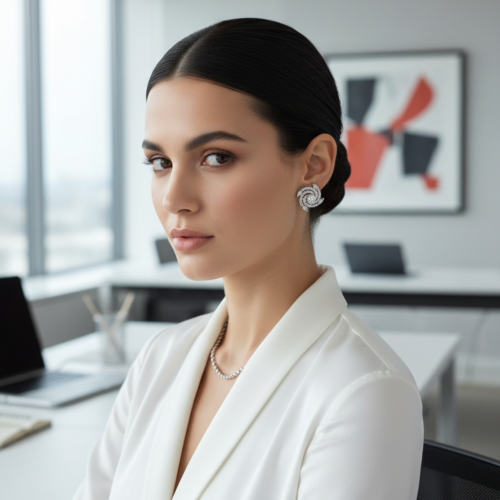 Pair the Spiral AD Studs with a sleek silver or pastel outfit — think satin blouse or flowy dress — to highlight their modern sparkle and elegant charm.