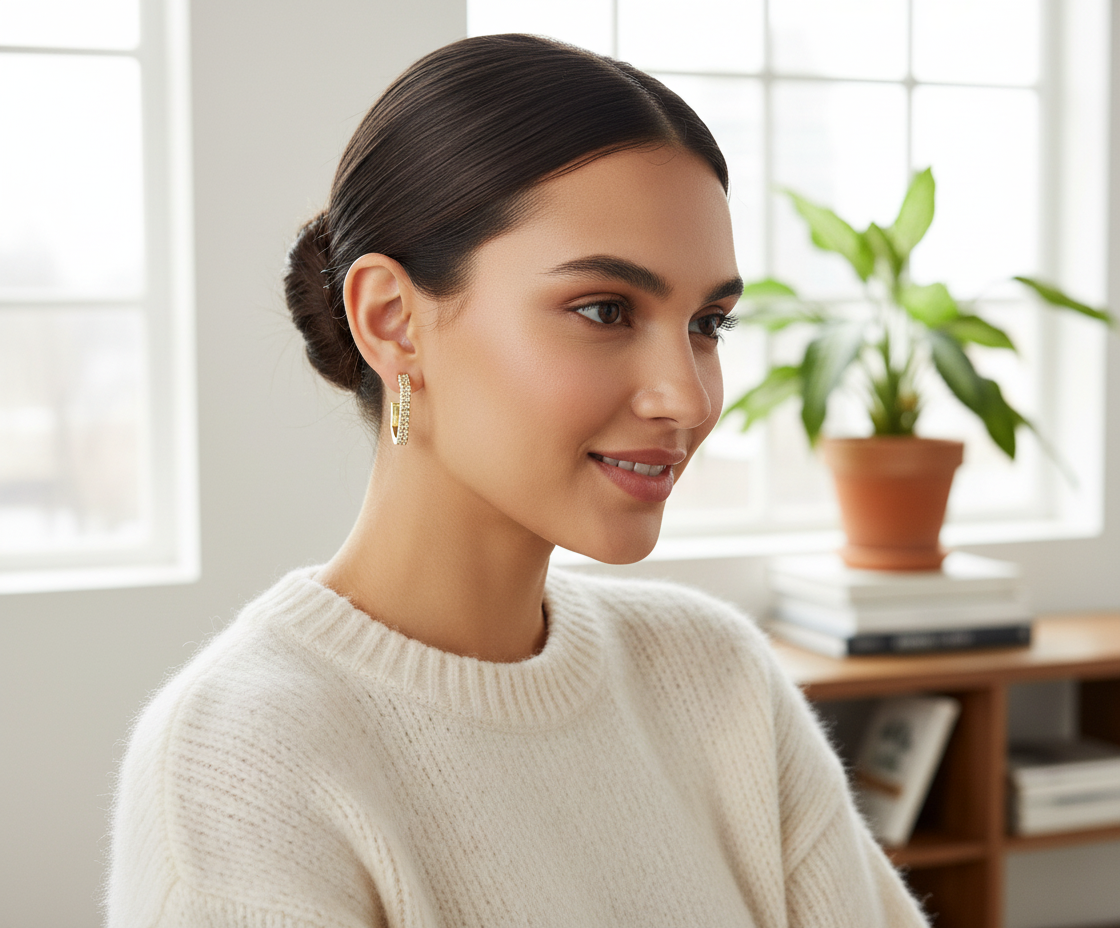 Elevate your look with the Square C Hoop earrings — their sleek golden finish and sparkling American diamonds pair beautifully with both chic evening wear and sharp office outfits. ✨