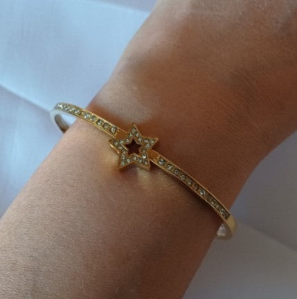 Shine bright with the Star Bangle—a sleek gold-toned bangle featuring a dazzling star centerpiece, encrusted with shimmering American diamonds. Perfect for adding a touch of celestial elegance to any look!