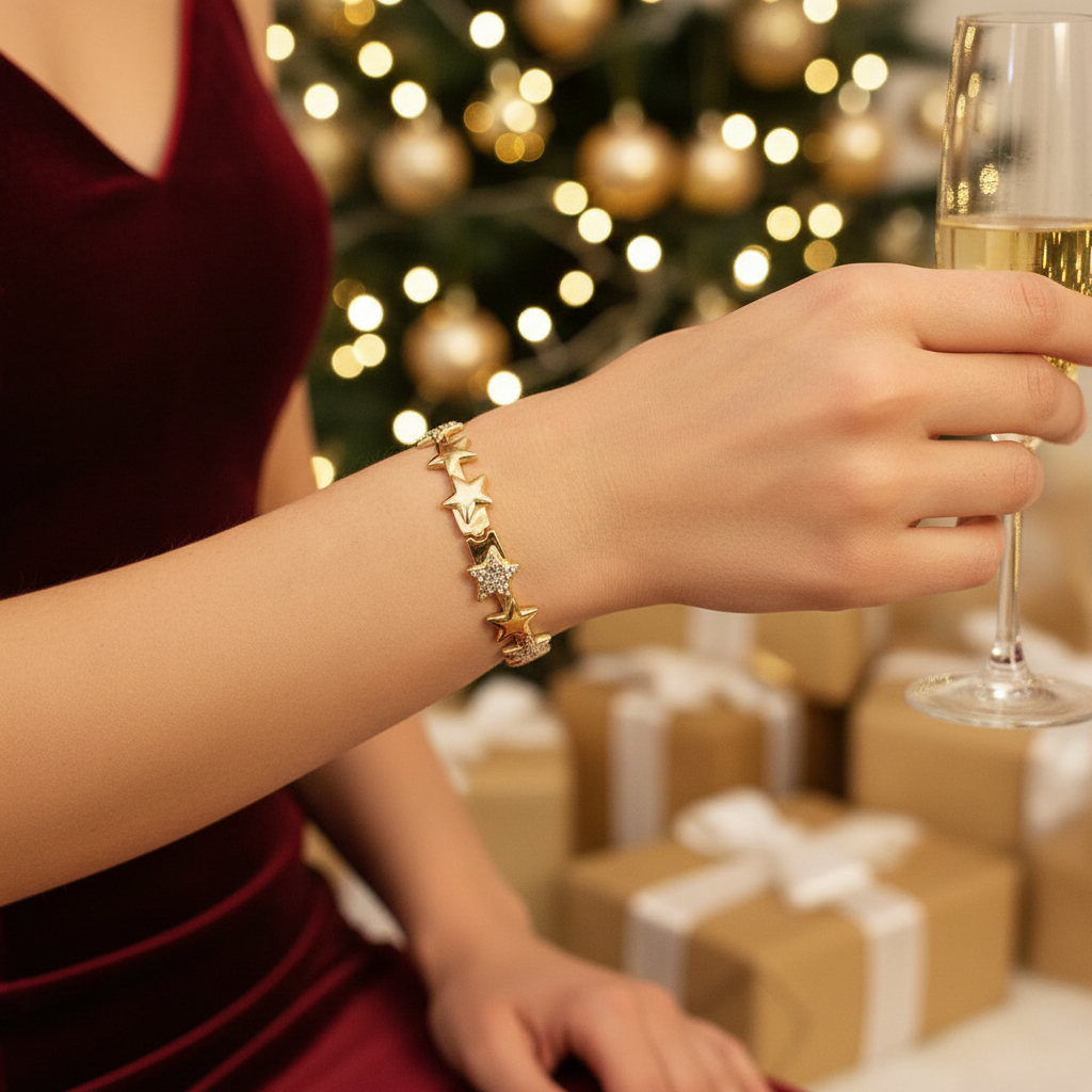 Pair the Star Bangle with a sleek black dress or evening outfit to let its golden sparkle and diamond-studded stars shine as the statement piece. ✨